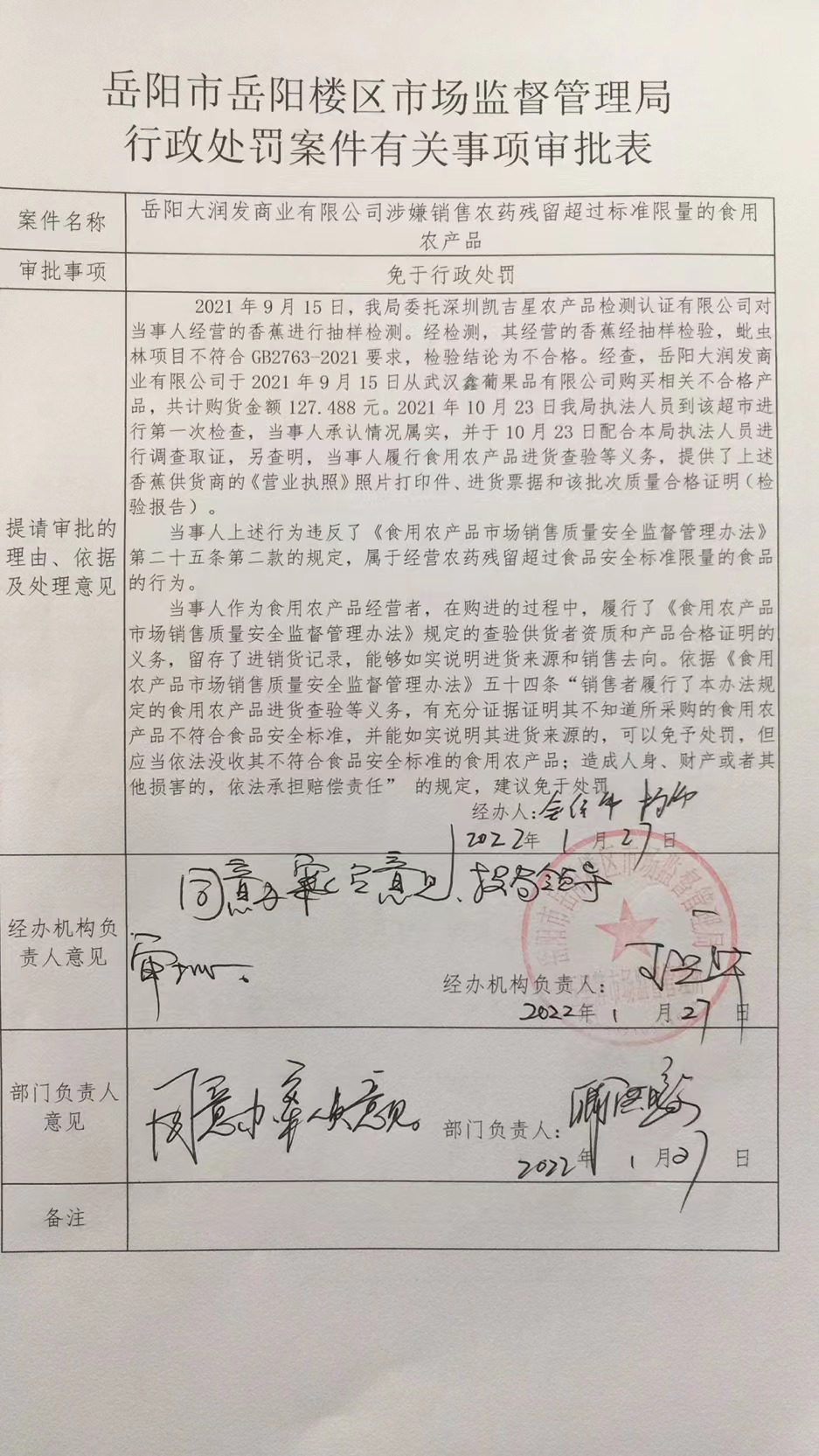 关于岳阳市大润发超市(国产香蕉)不合格食品不予立案审批表