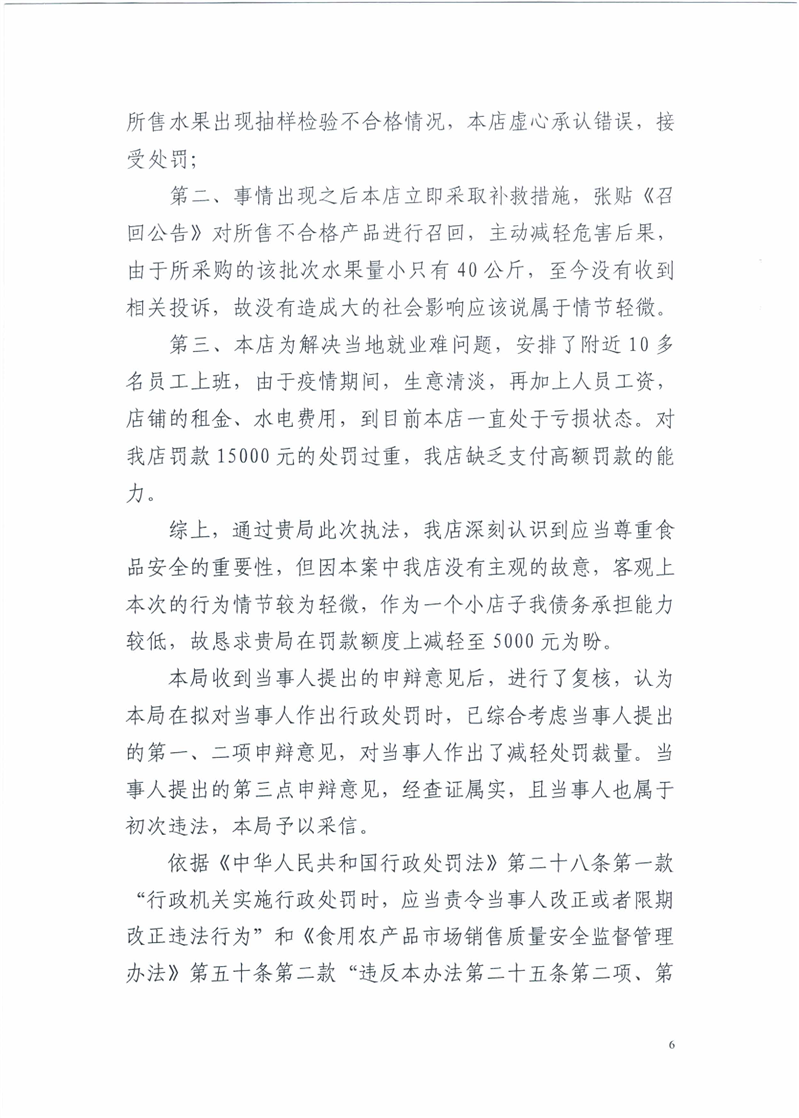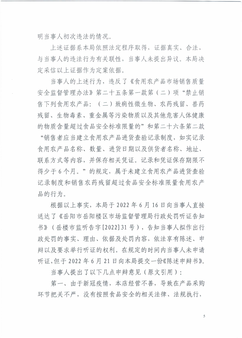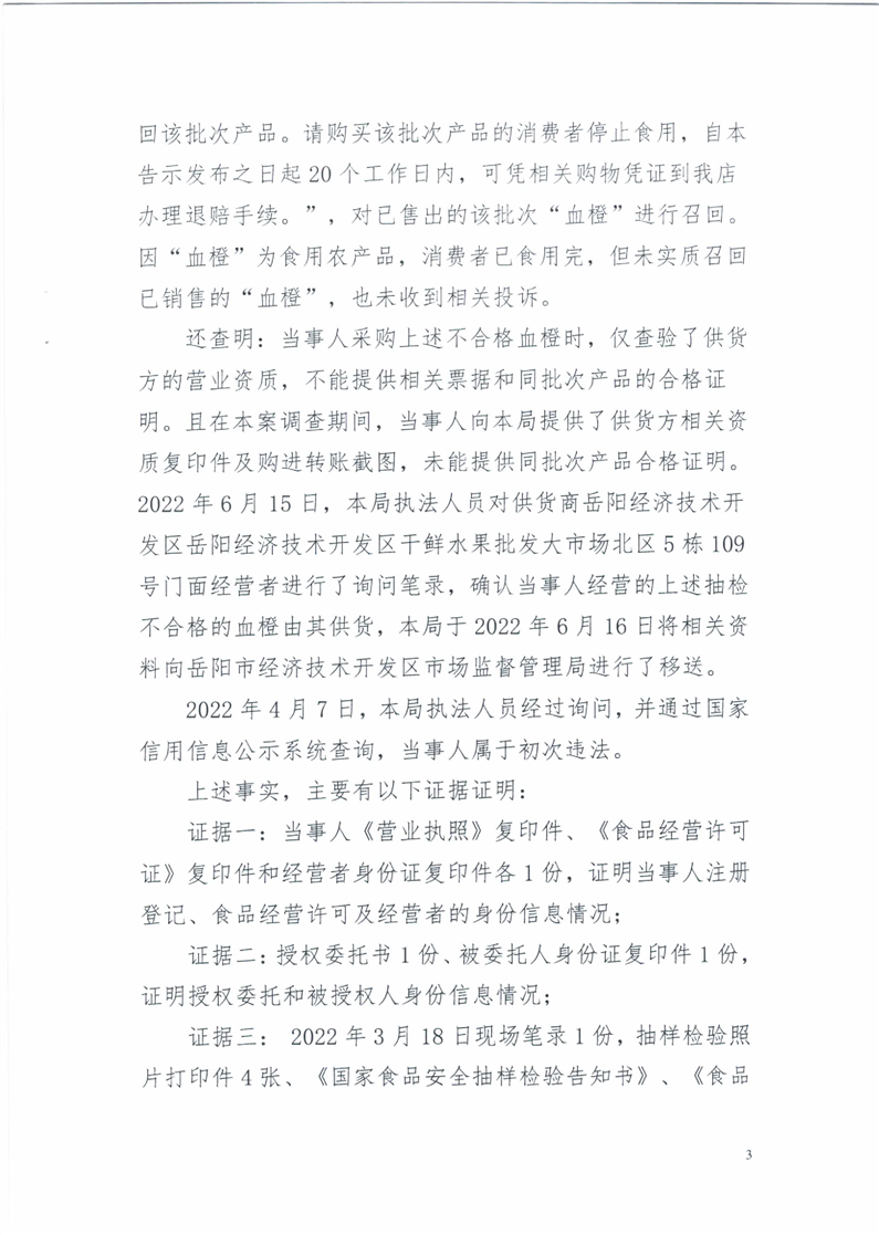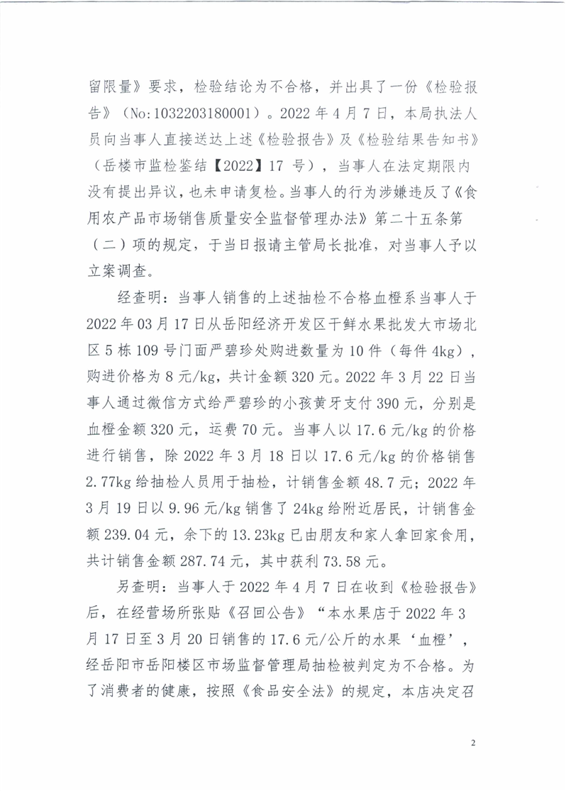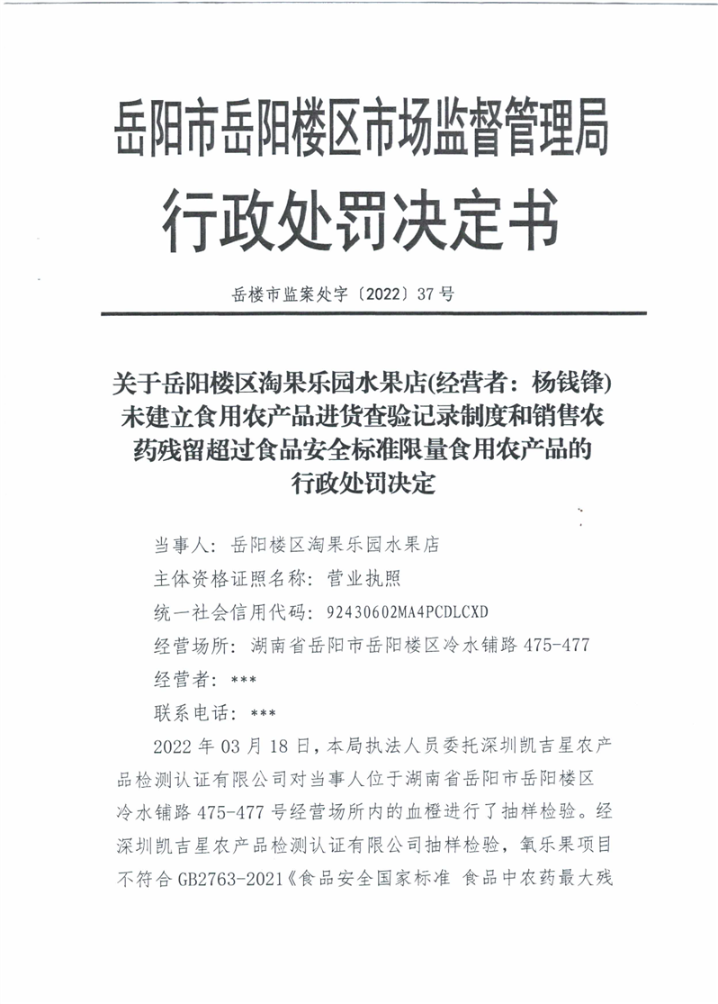 关于岳阳楼区淘果乐园水果店销售不合格食品(血橙)行政处罚决定书
