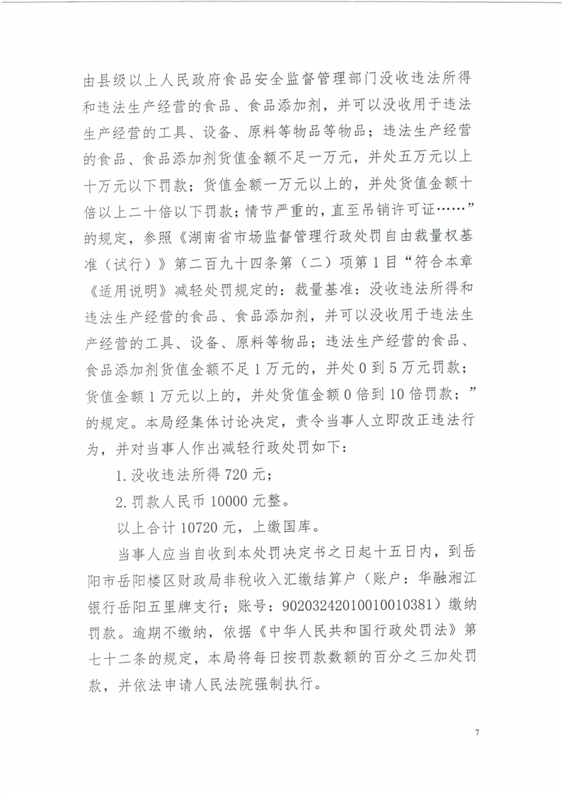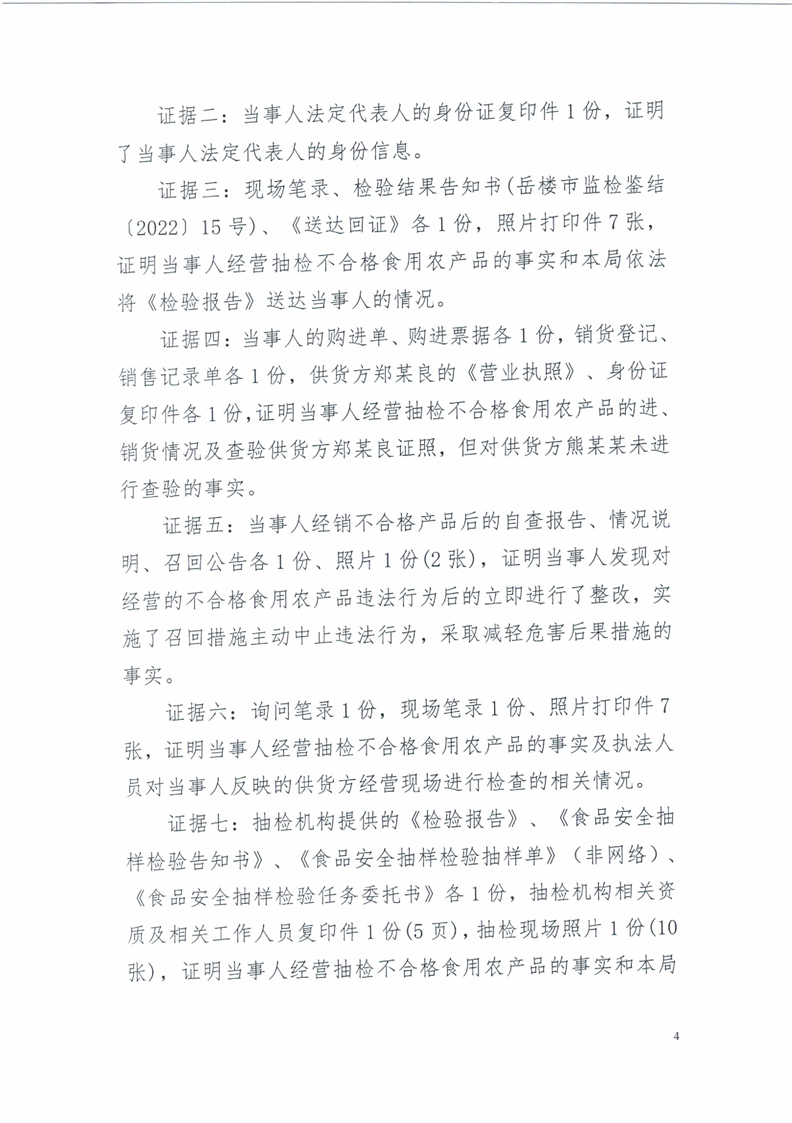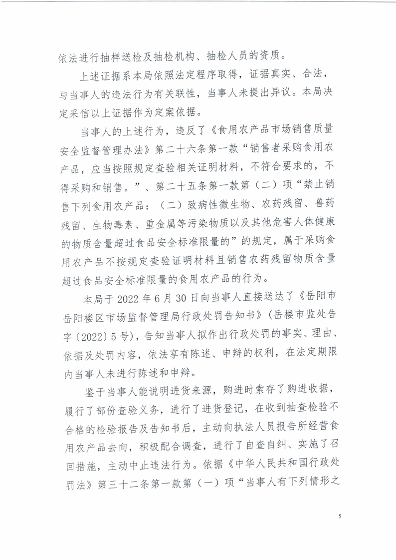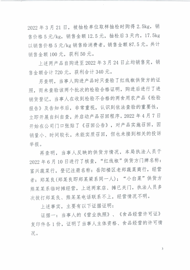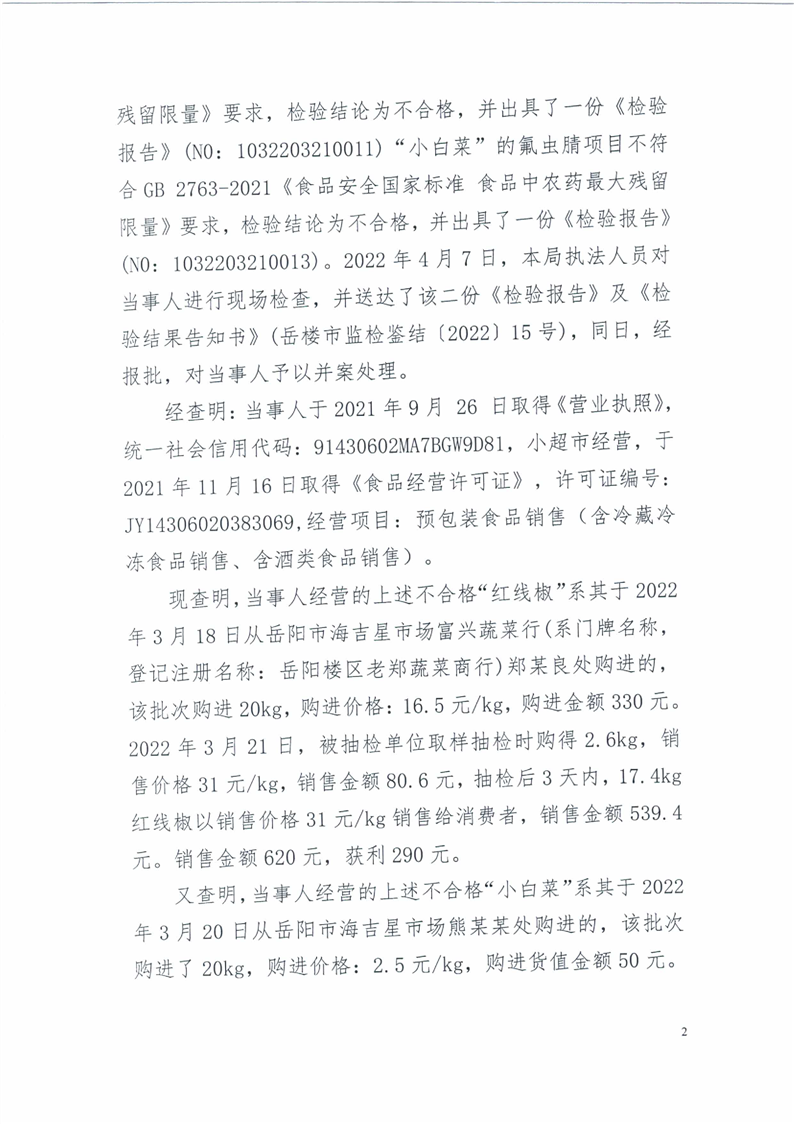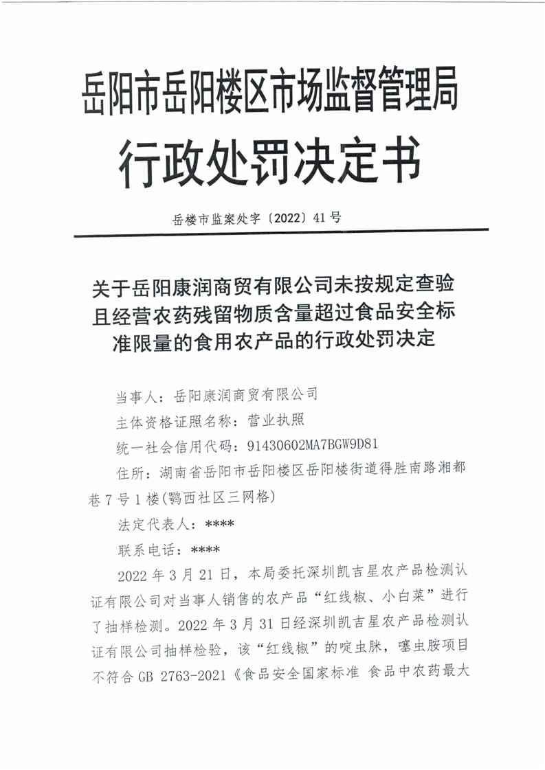 关于岳阳康润商贸有限公司销售不合格食品(红线椒、小白菜)行政处罚决定书