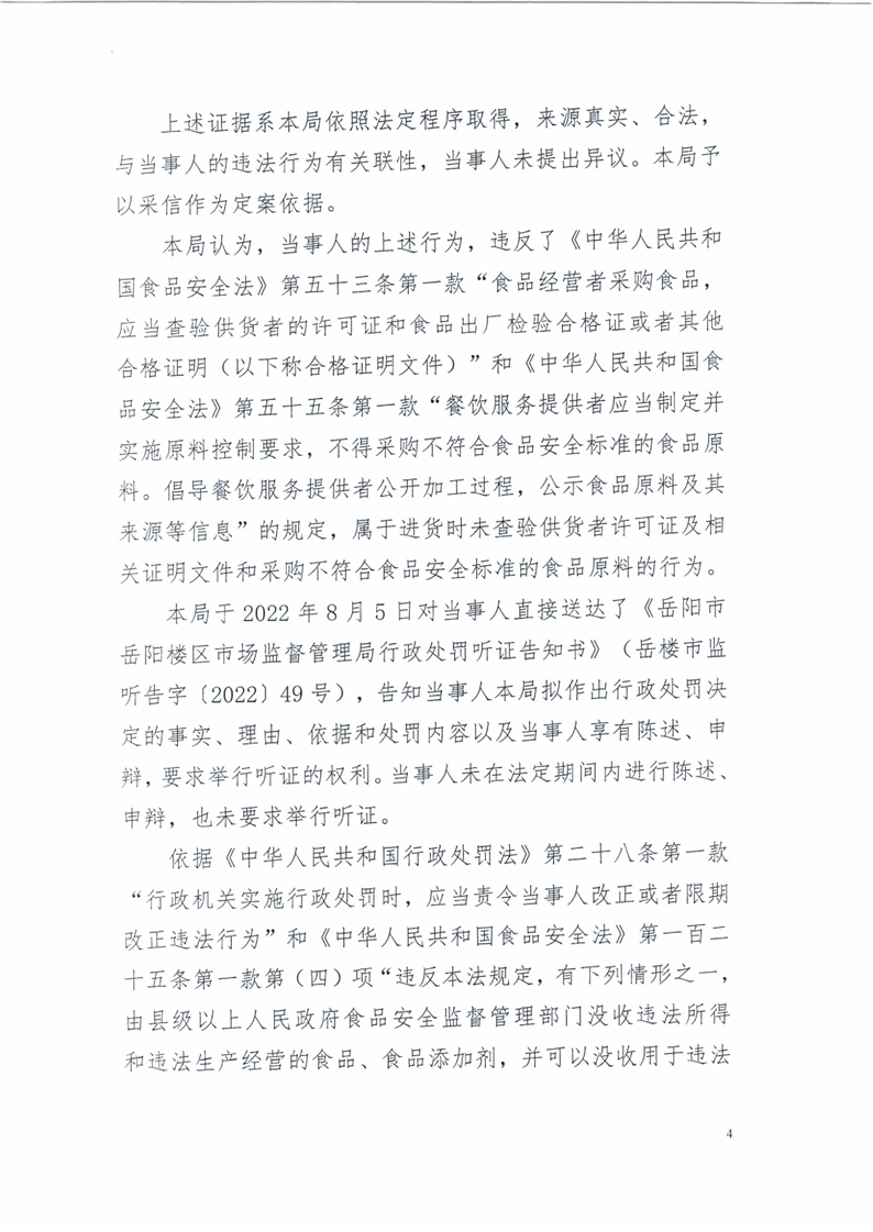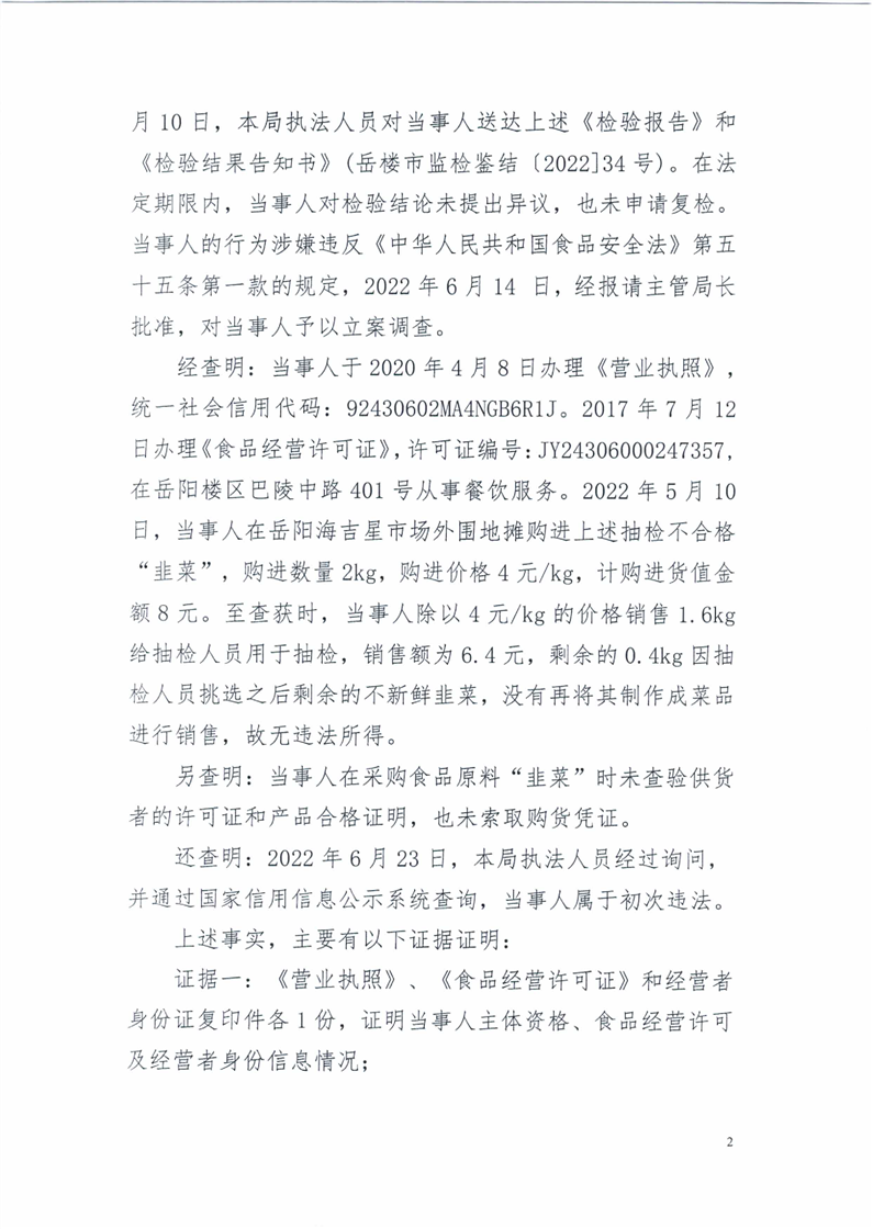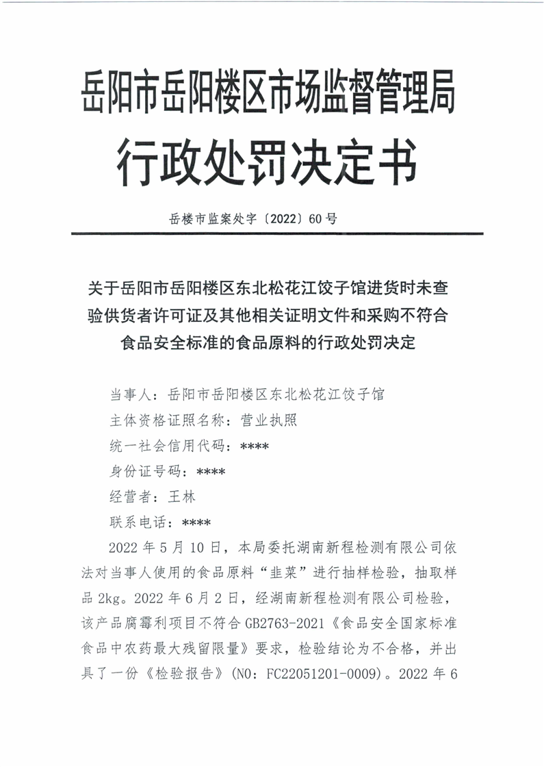 关于岳阳楼区东北松花江饺子馆采购不符合食品安全标准的食品原料(韭菜)行政处罚决定书