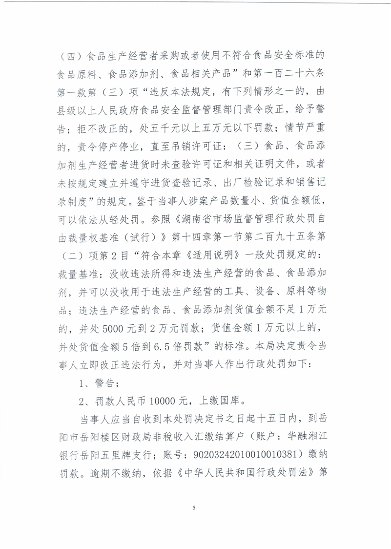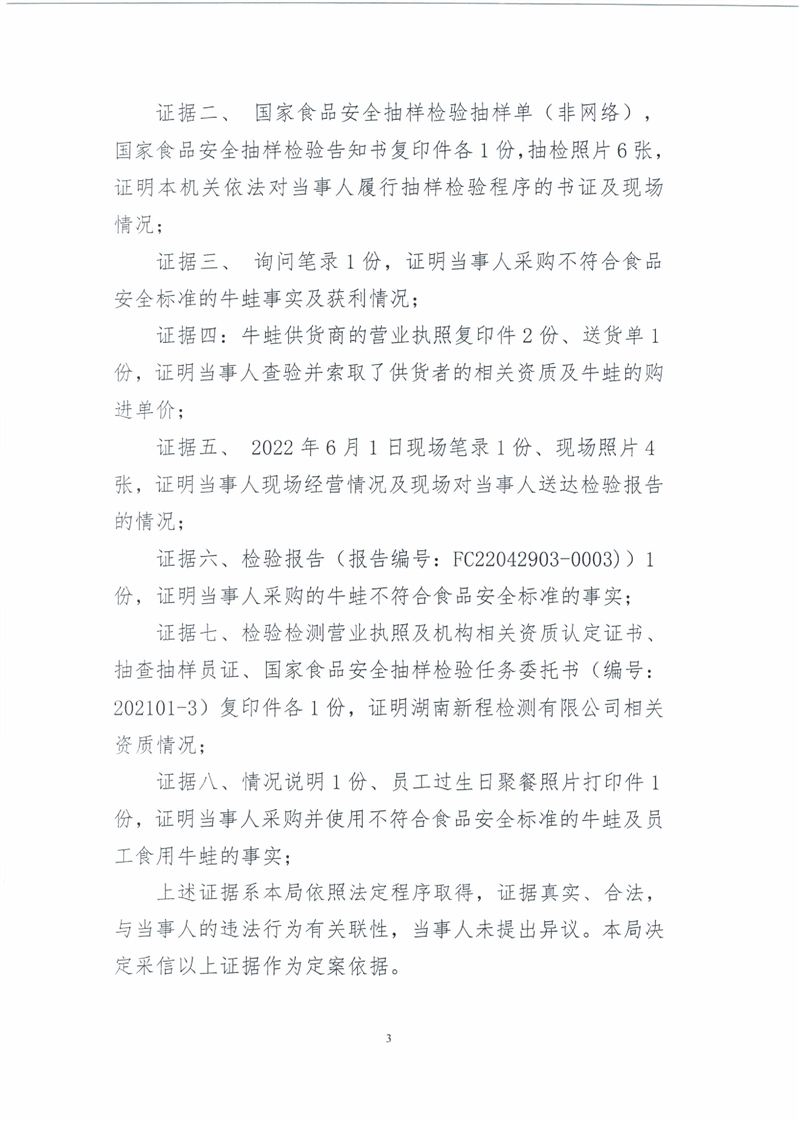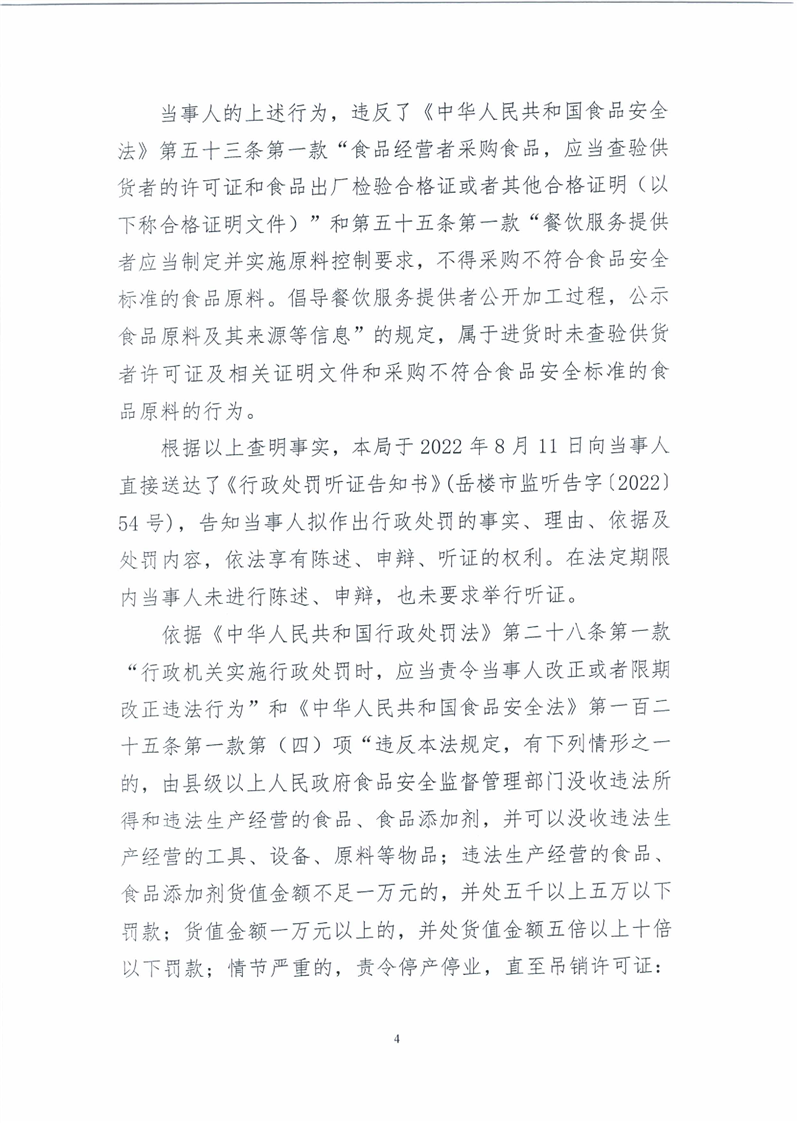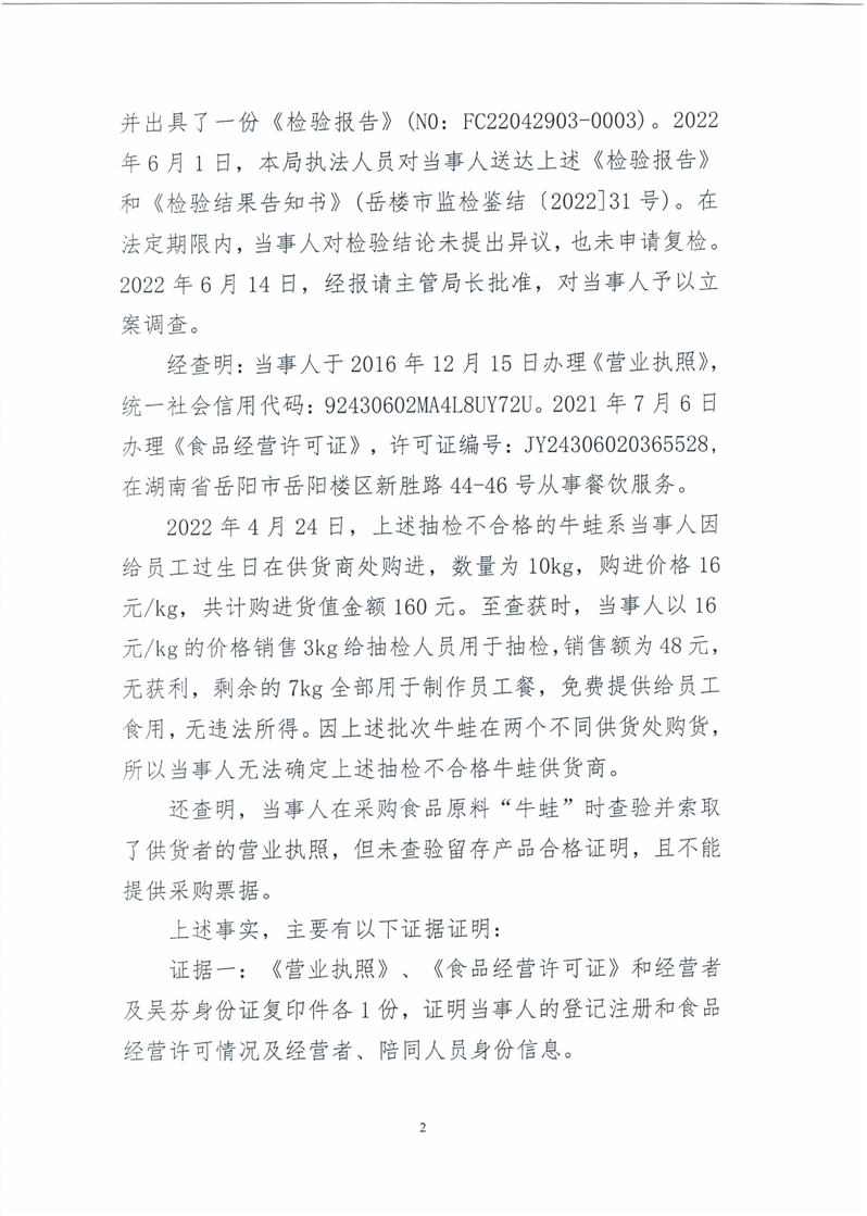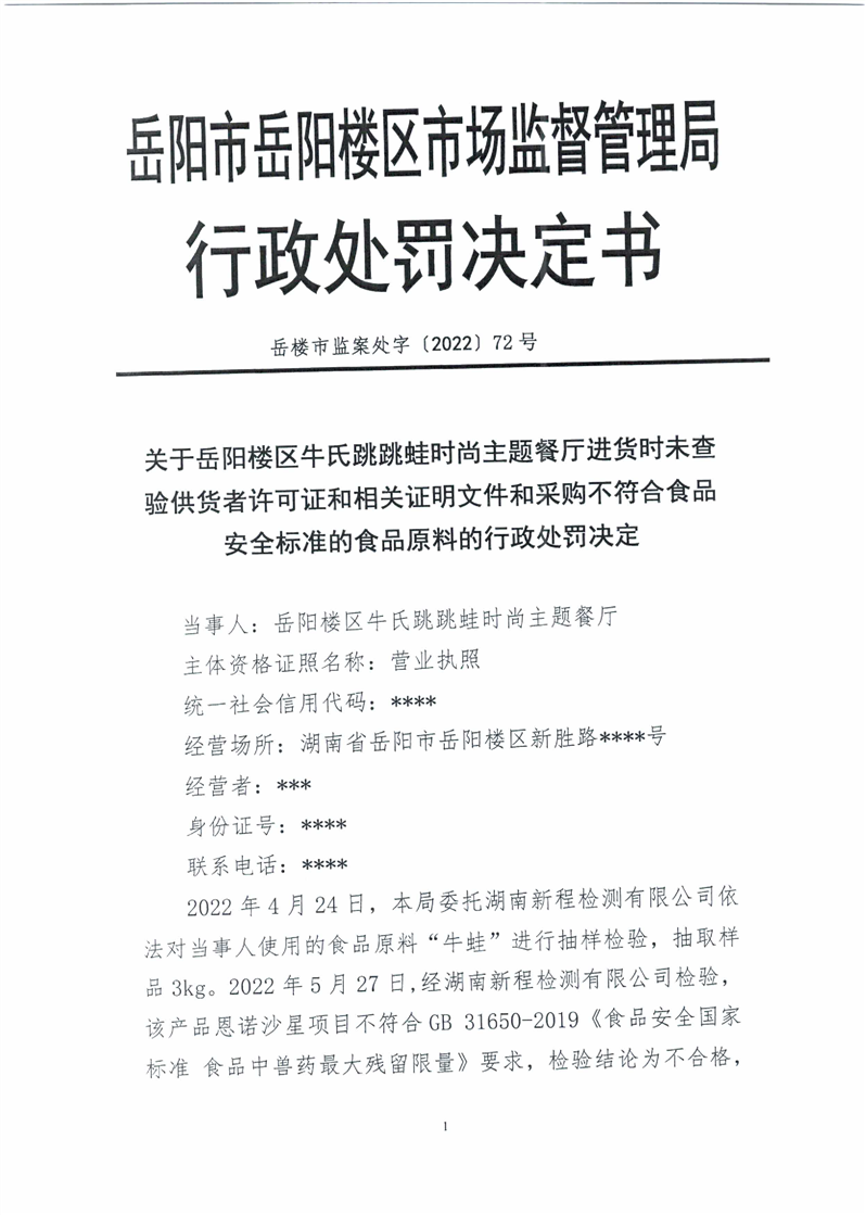关于岳阳楼区牛氏跳跳蛙时尚主题餐厅未建立进货查验记录和采购不符合食品安全标准的食品原料(牛蛙)行政处罚决定书