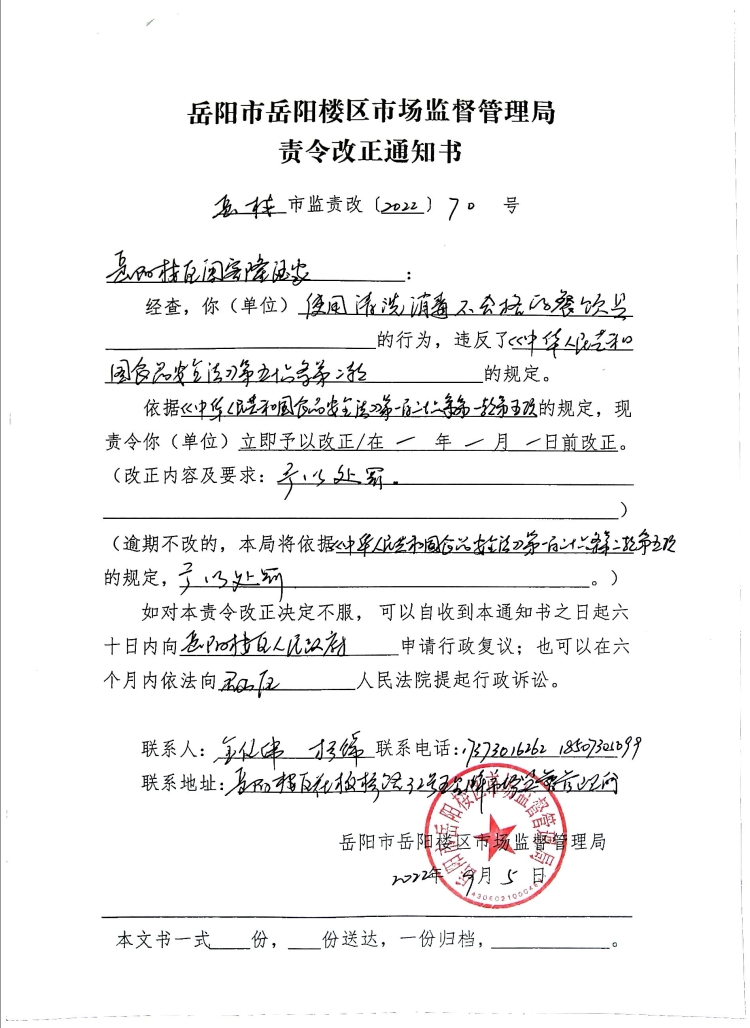 关于岳阳楼区闽客隆酒家使用不合格餐具的责令改正通知书