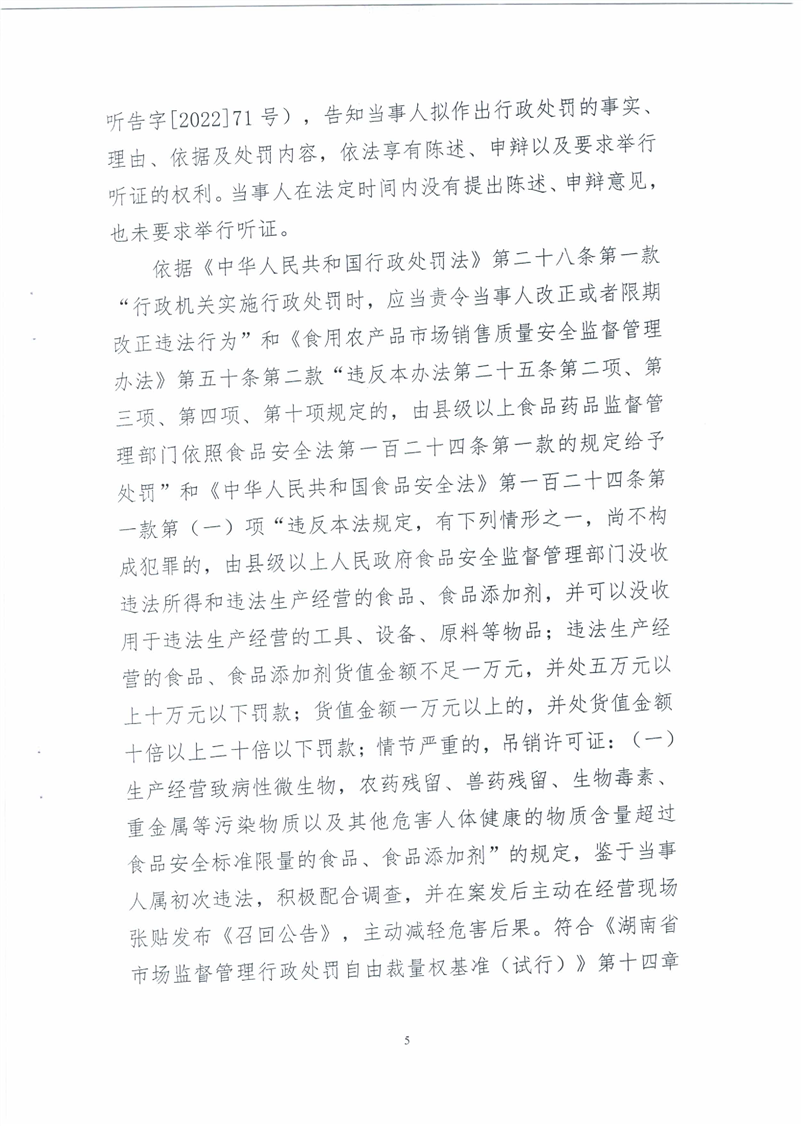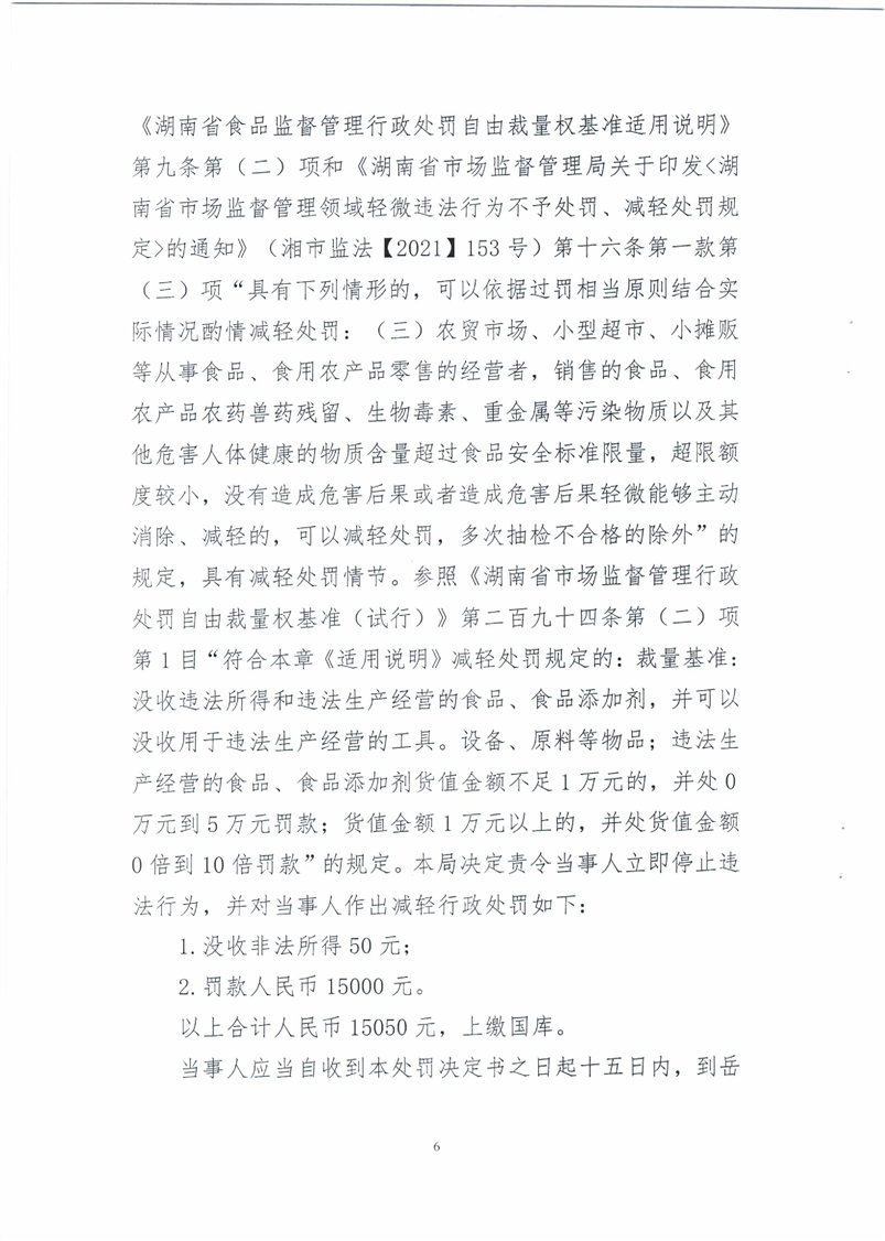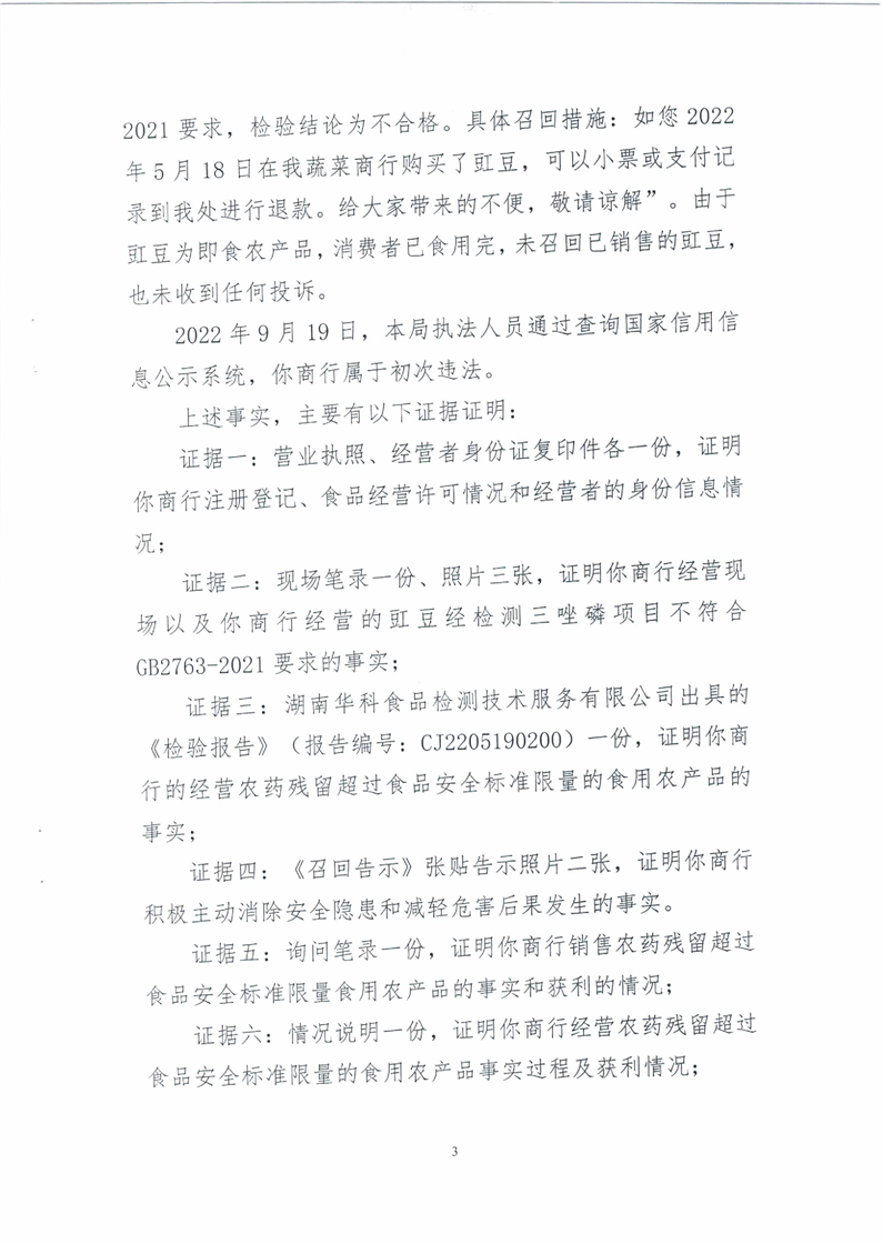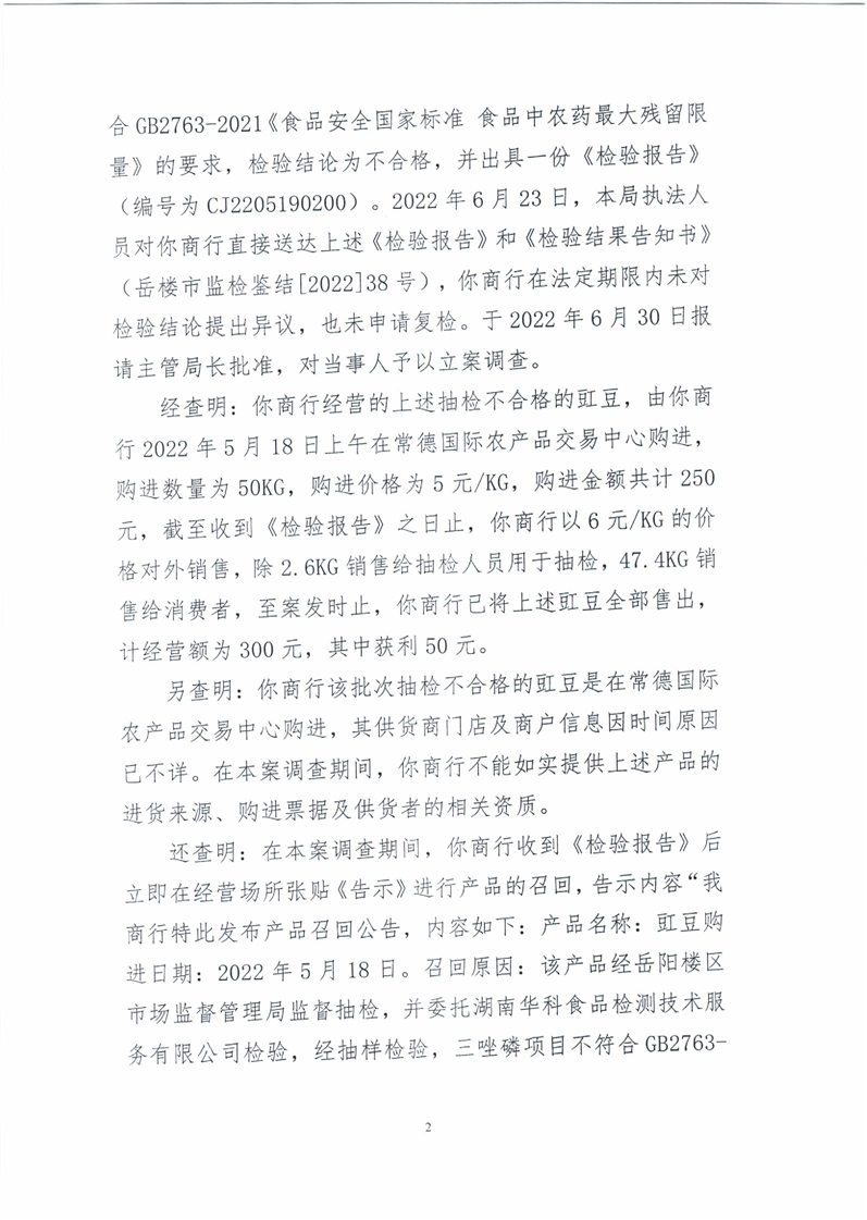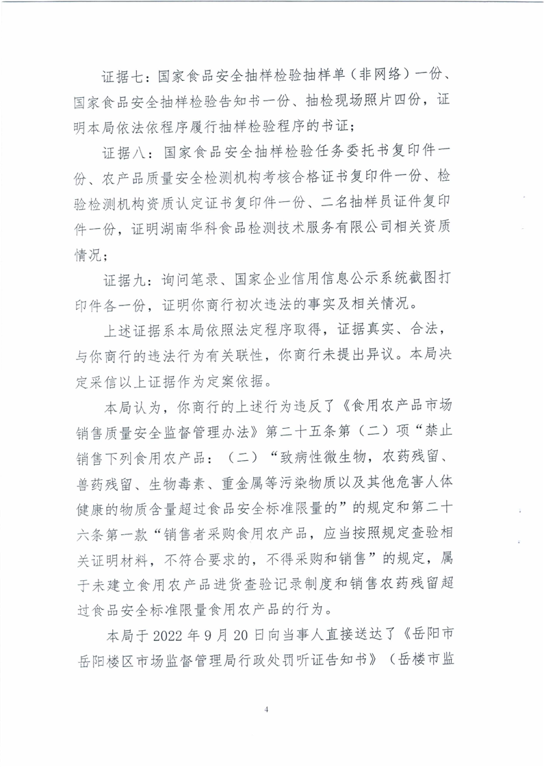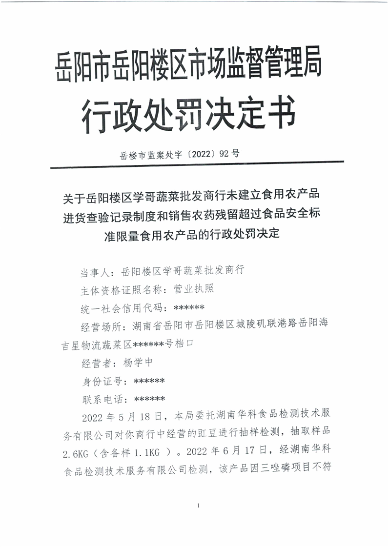 岳阳楼区市场监管局关于岳阳楼区学哥蔬菜批发商行销售不合格食品(豇豆)行政处罚决定