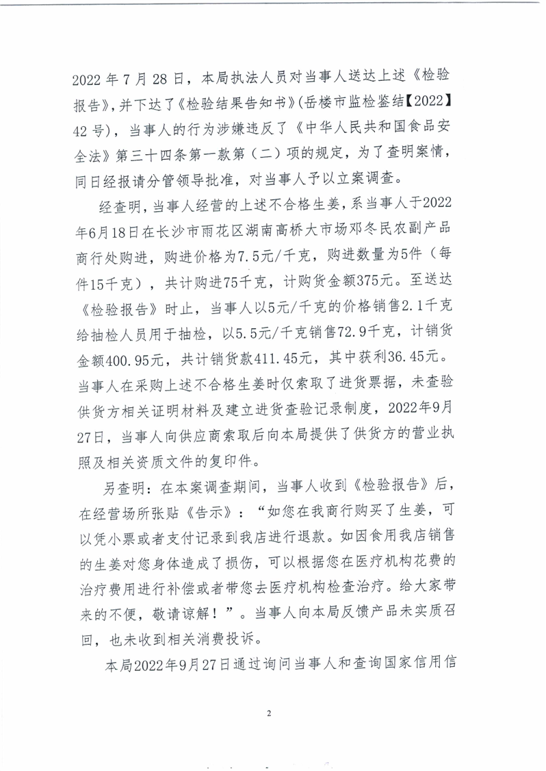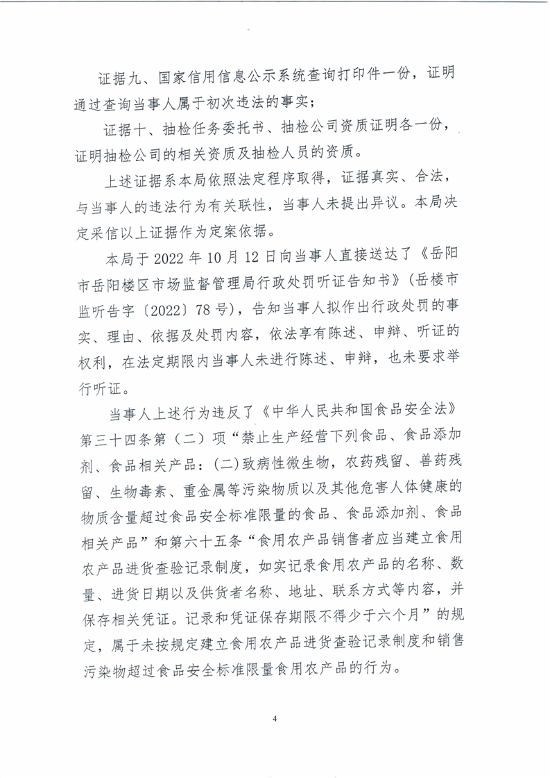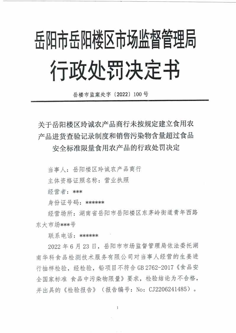 关于岳阳楼区玲诚农产品商行未按规定建立食用农产品进货查验记录制度和销售污染物含量超过食品安全标准限量食用农产品的行政处罚决定