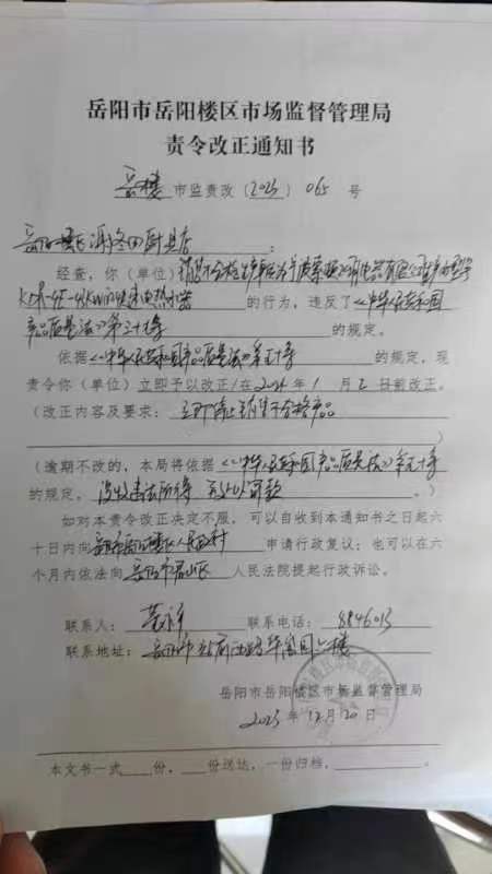 谢东田厨具店快速电热水器抽检不合格责令改正通知书