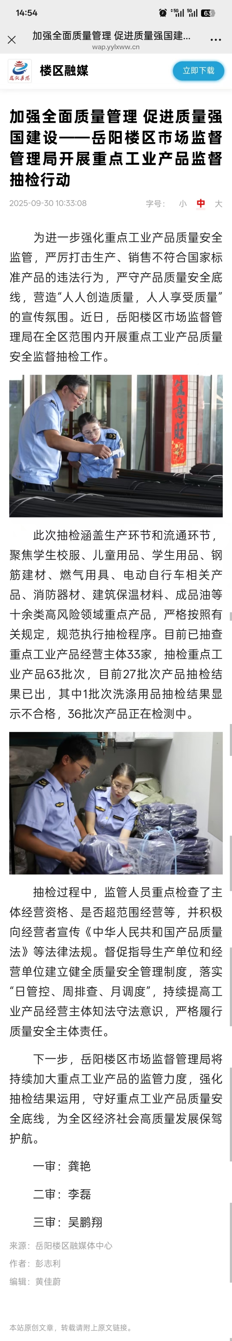 加强全面质量管理 促进质量强国建设——岳阳楼区市场监督管理局开展重点工业产品监督抽检行动(宣传报道)