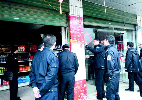 3月16日,岳阳楼区安委会组织安监、公安、城管及奇家岭办事处等单位共80余人,对奇家岭学院路烟花爆竹市场展开集中整治行动,共搜查门店10余家,清缴鞭炮及礼花300余件。 (王昕力 符爱民 摄)