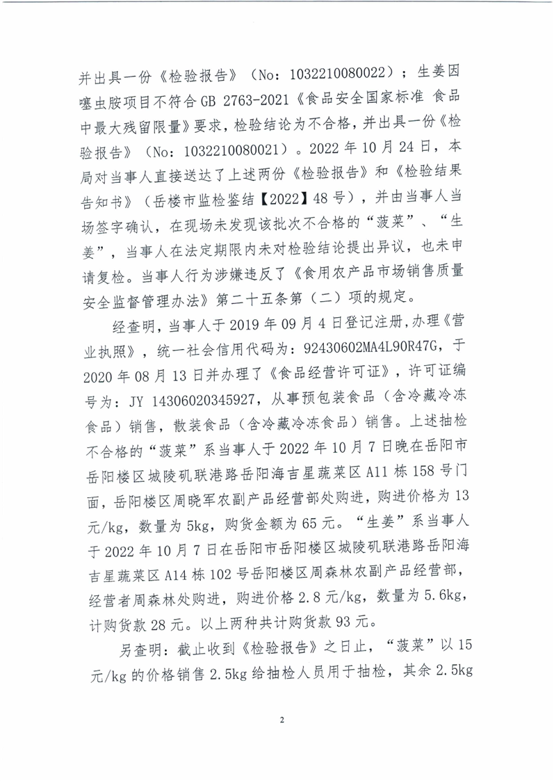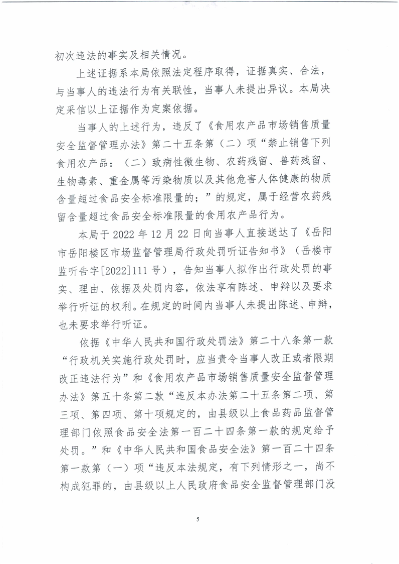 关于岳阳楼区玲菁菜店经营农药残留含量超过食品安全标准限量的食用农产品的行政处罚决定