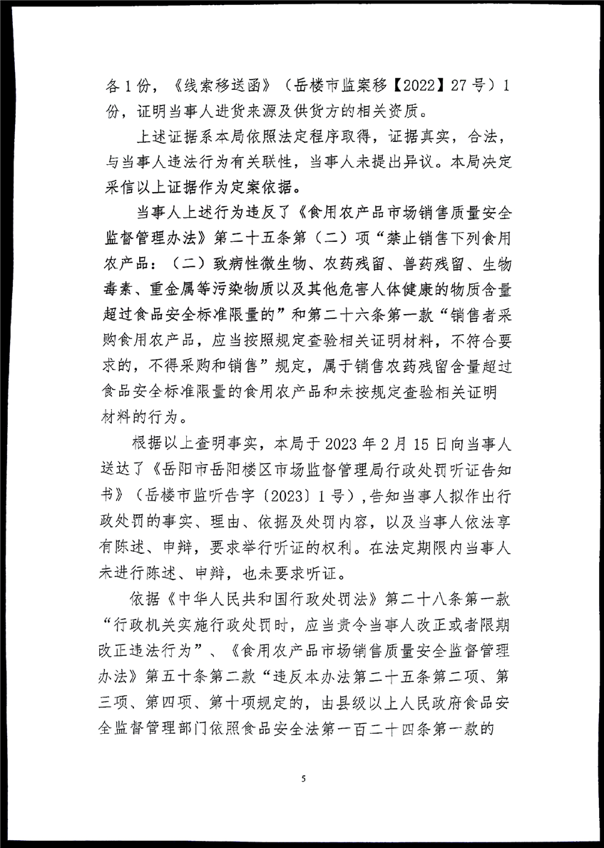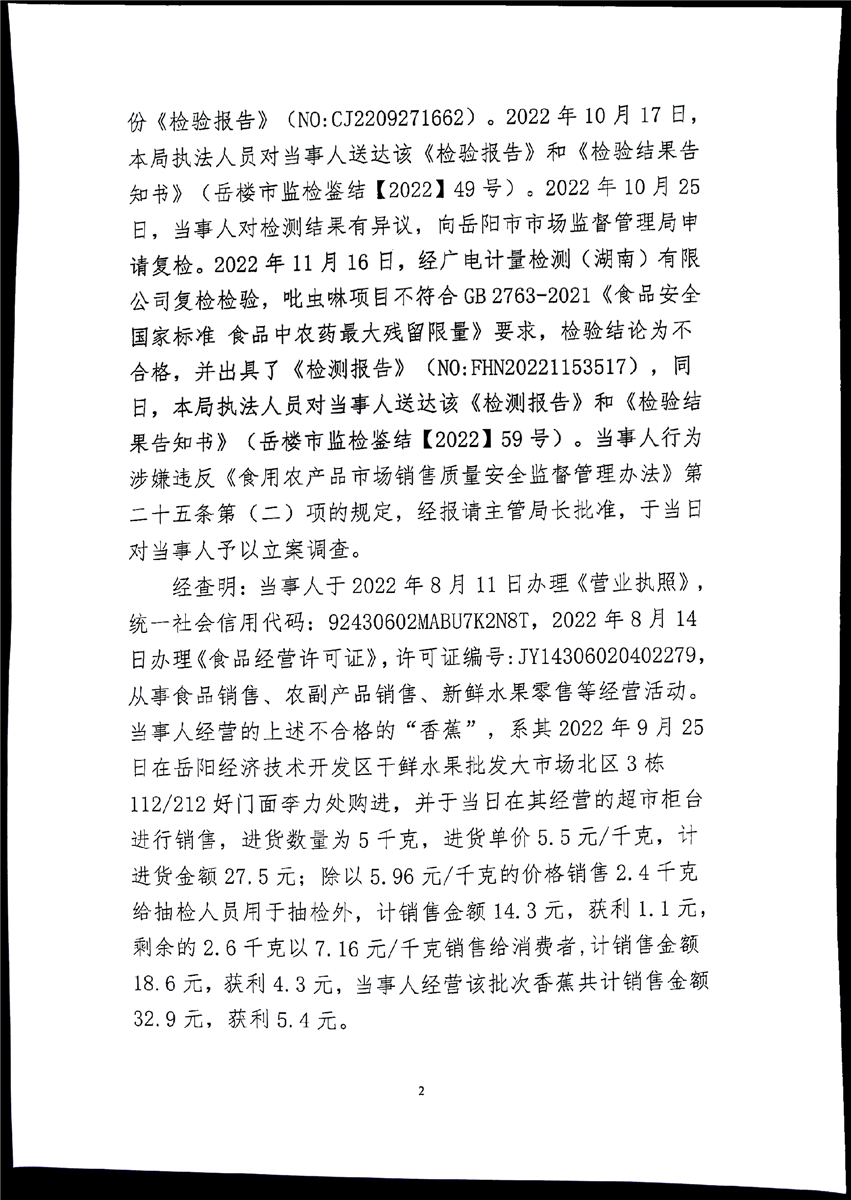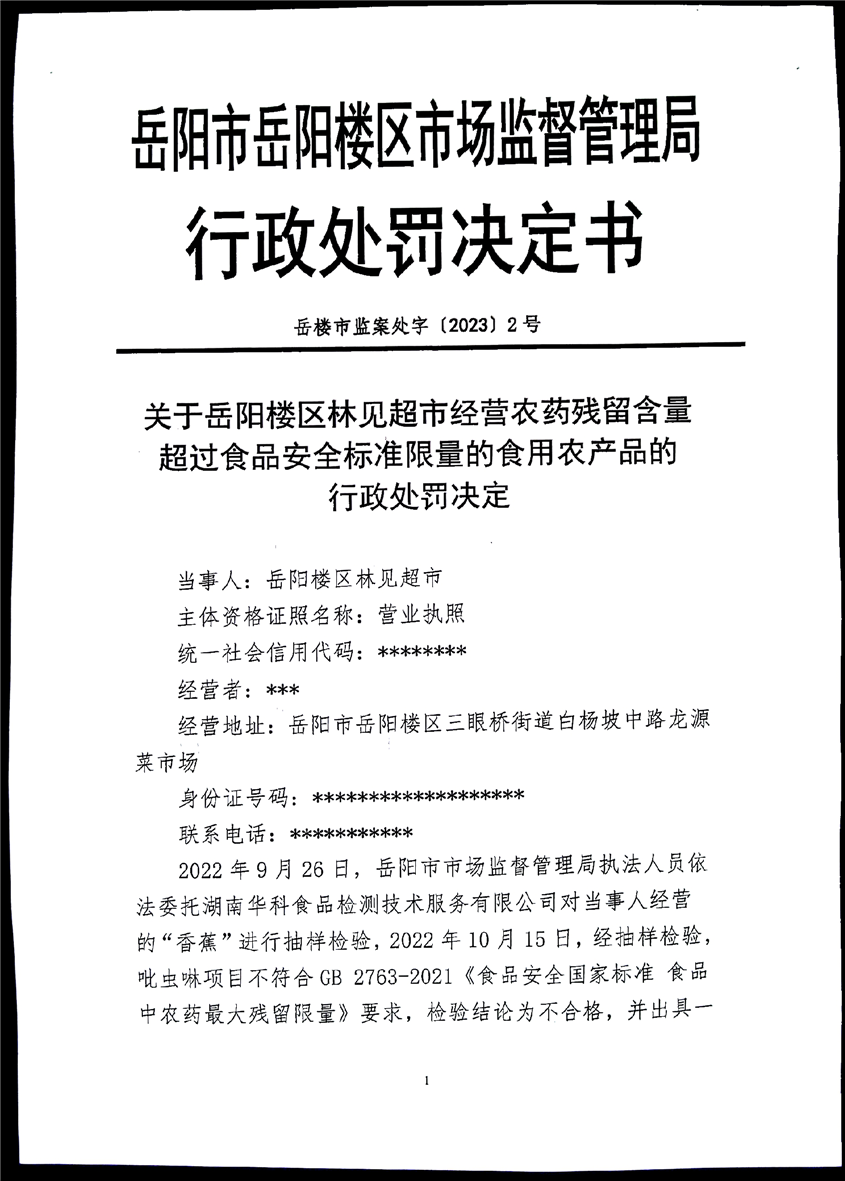 关于岳阳楼区林见超市经营农药残留含量超过食品安全标准限量的食用农产品的行政处罚决定