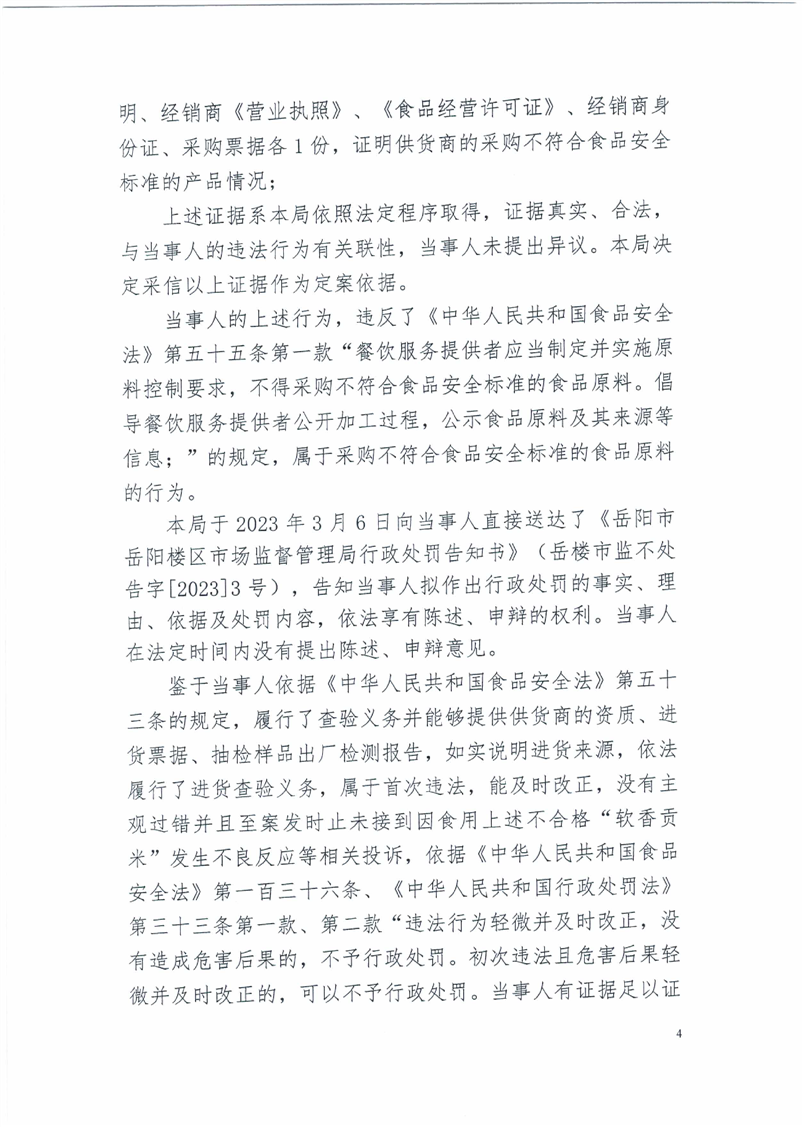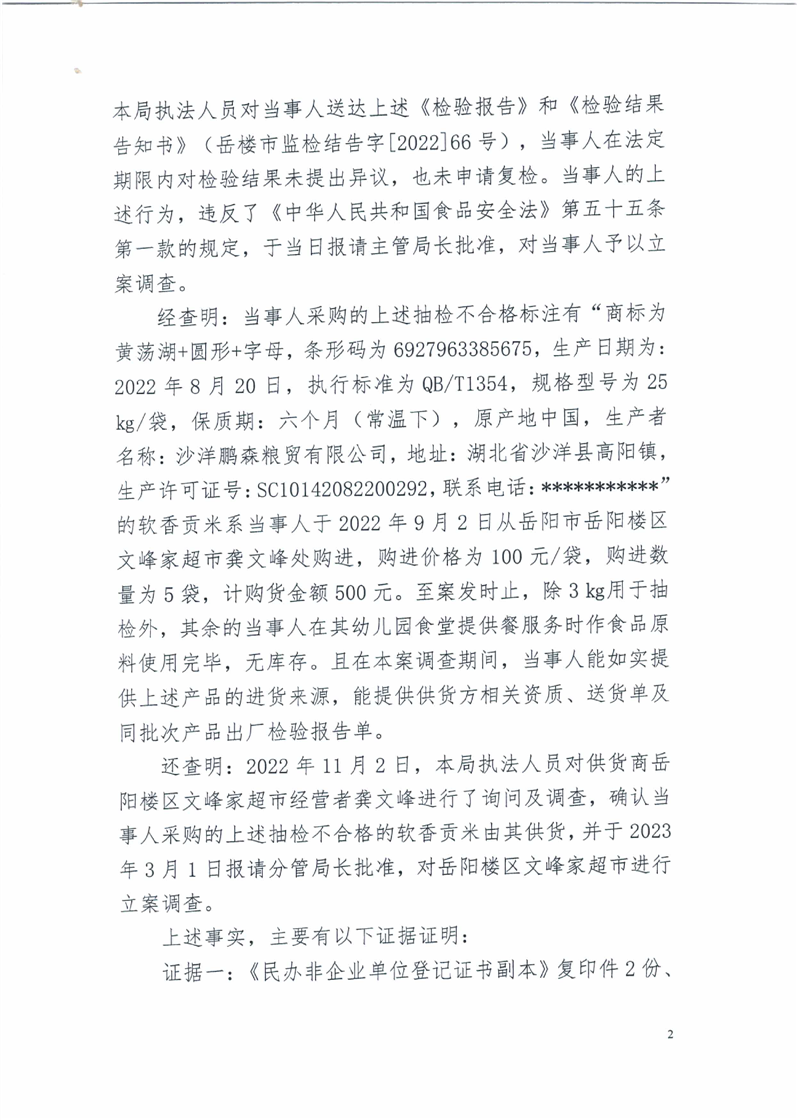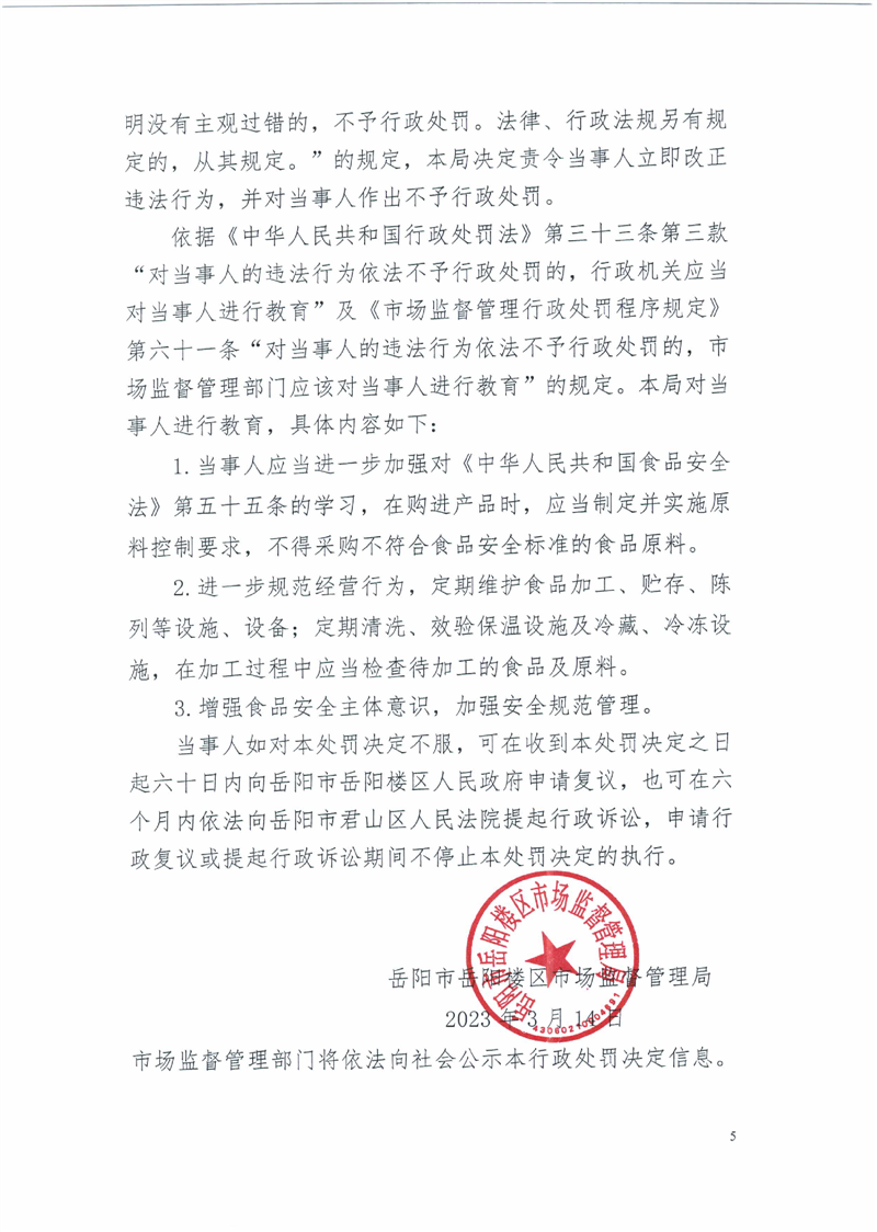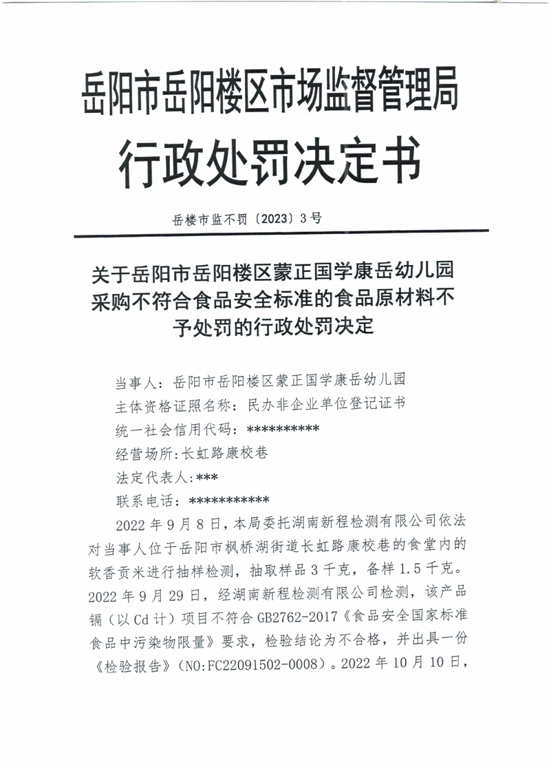 关于岳阳市岳阳楼区蒙正国学康岳幼儿园采购不符合食品安全标准的食品原材料不予处罚的行政处罚决定