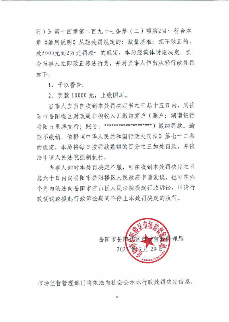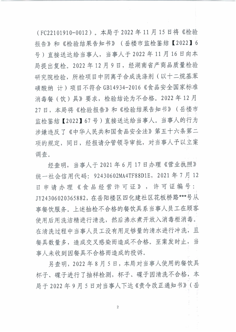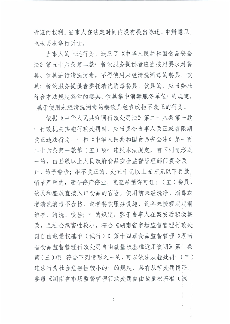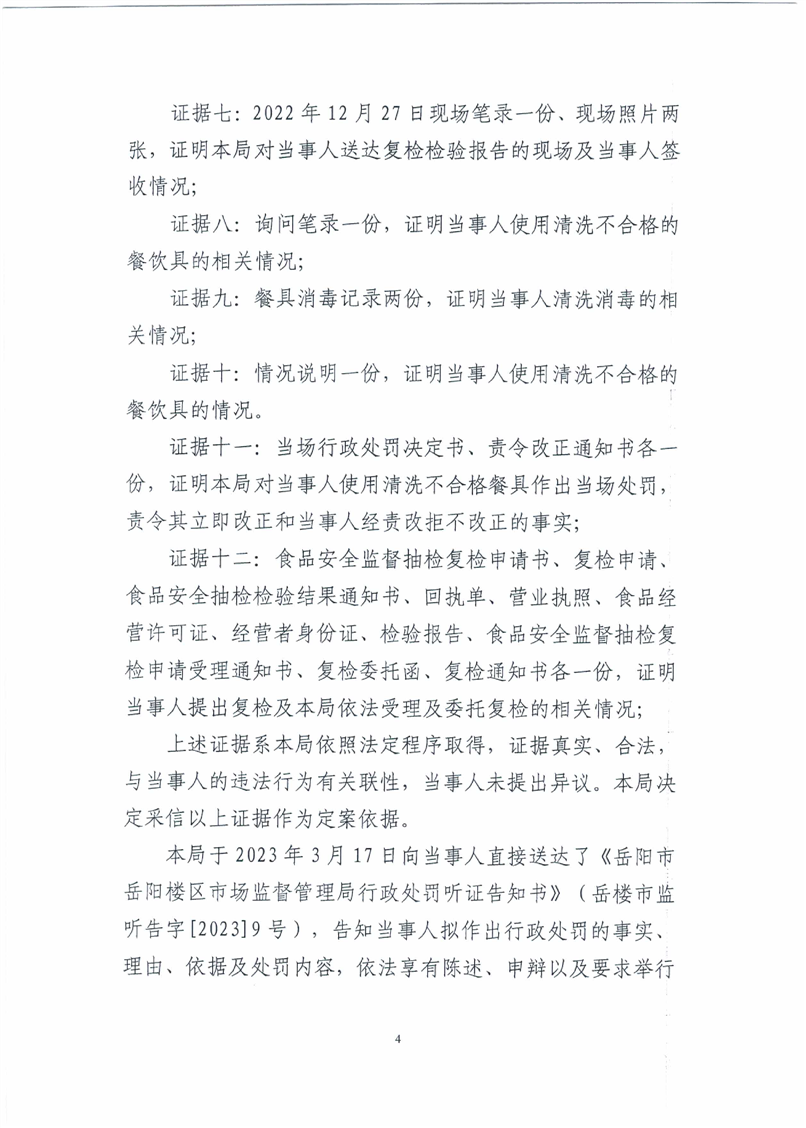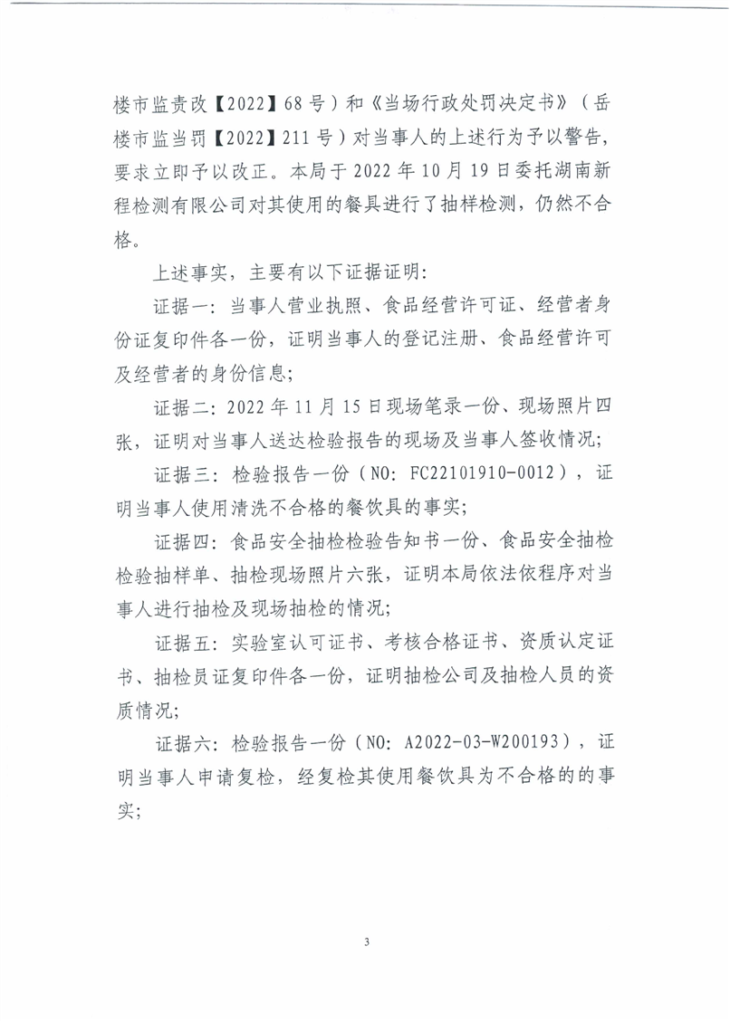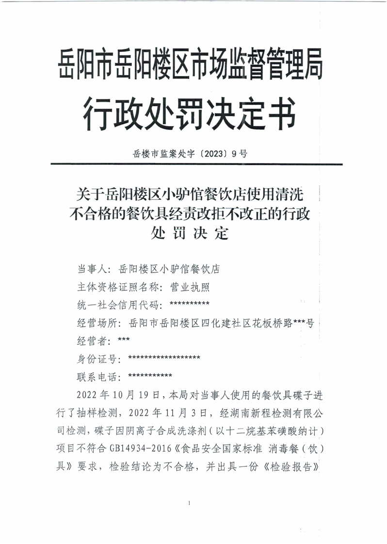 关于岳阳楼区小驴倌餐饮店使用清洗不合格的餐饮具经责改拒不改正的行政处罚决定
