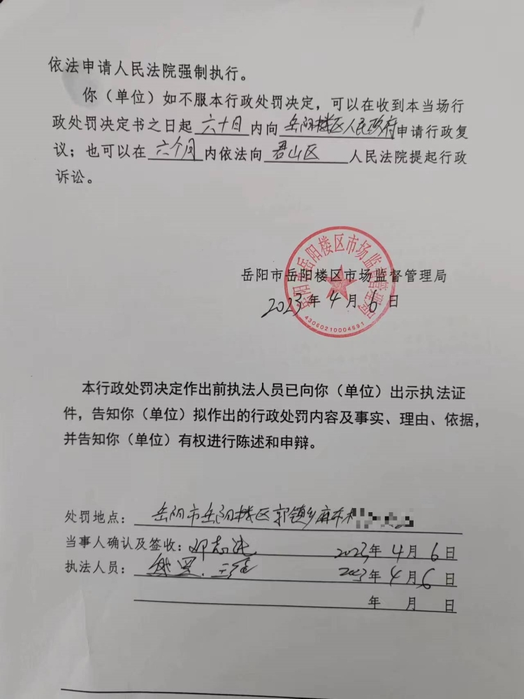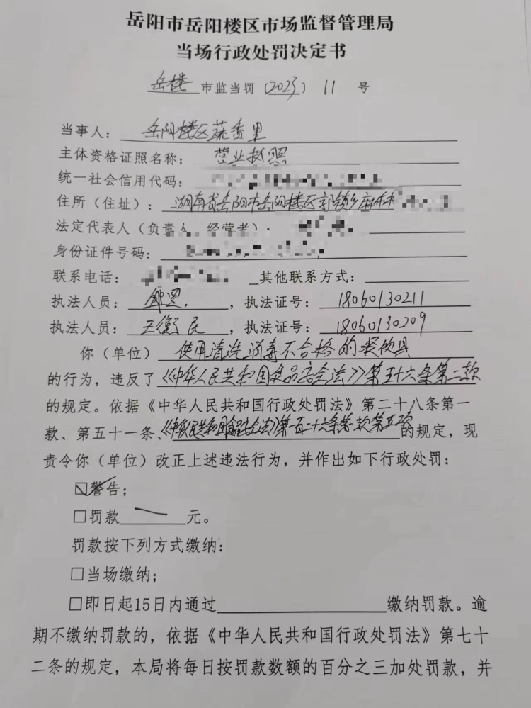 关于岳阳楼区蔬香里餐饮店使用不合格餐具当场行政处罚决定书