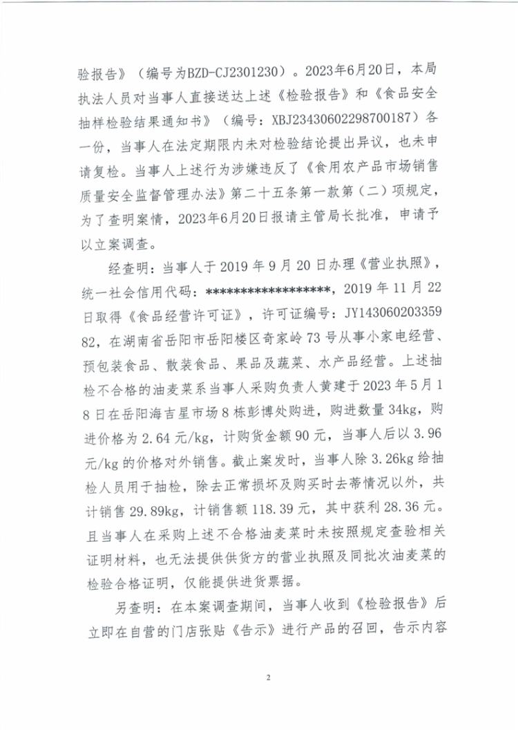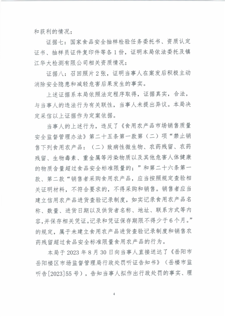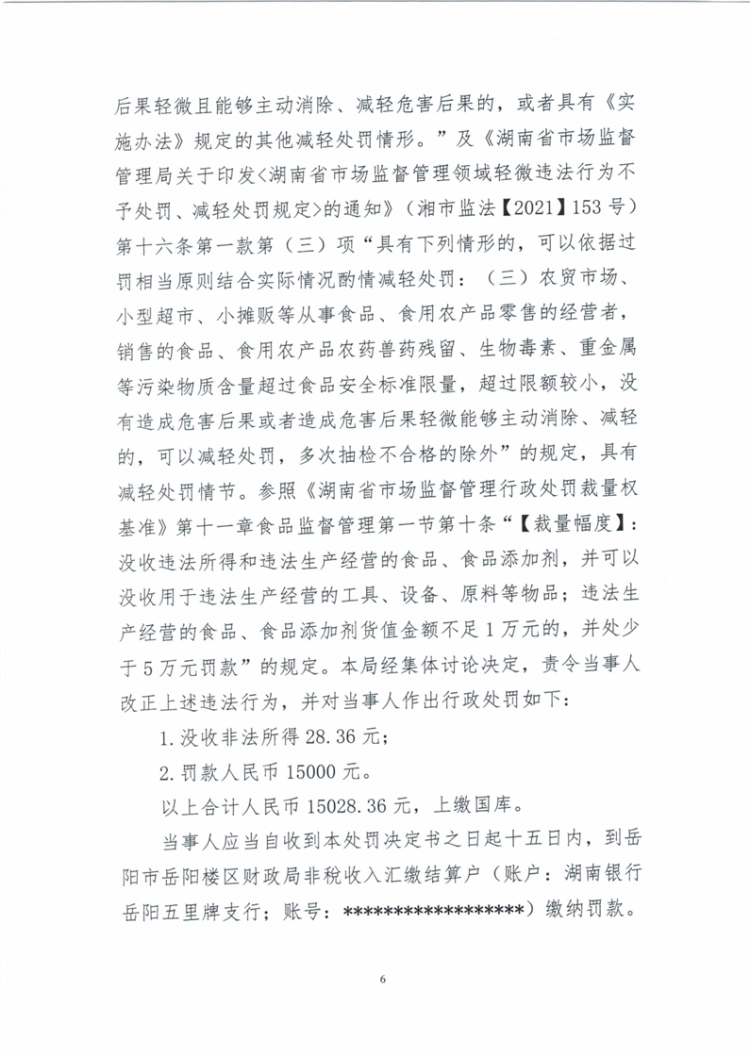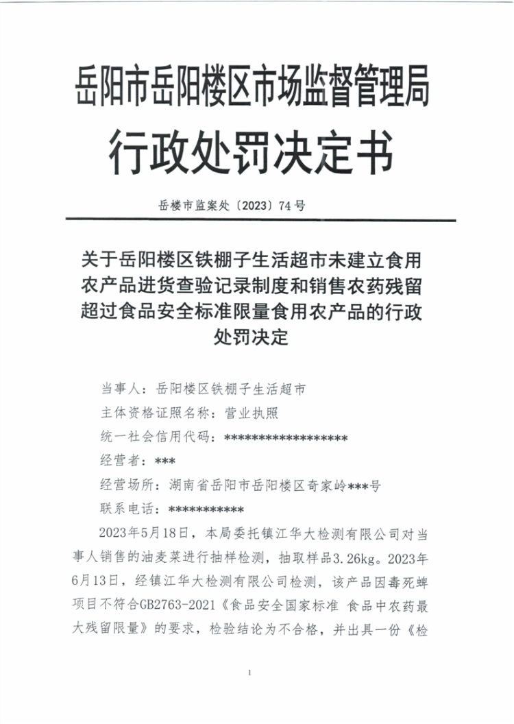 关于岳阳楼区铁棚子生活超市未建立食用农产品进货查验记录制度和销售农药残留超过食品安全标准限量食用农产品的行政处罚决定
