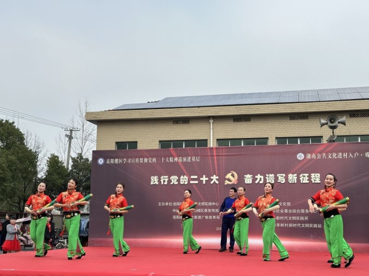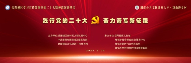 2月24日上午,由岳阳楼区新时代文明实践中心、区委宣传部、区文化旅游广电体育局主办、区文化馆、郭镇乡社会事业综合服务中心、郭镇乡新时代文明实践所承办的“践行党的二十大 奋力谱写新征程”——岳阳楼区学习宣传贯彻党的二十大精神巡演进基层活动在郭镇乡枣树村隆重举行,进一步掀起了学习宣传贯彻党的二十大精神热潮。