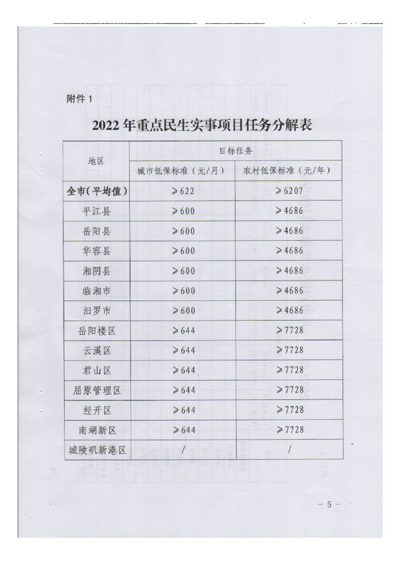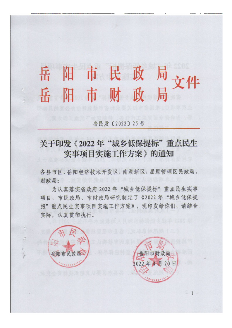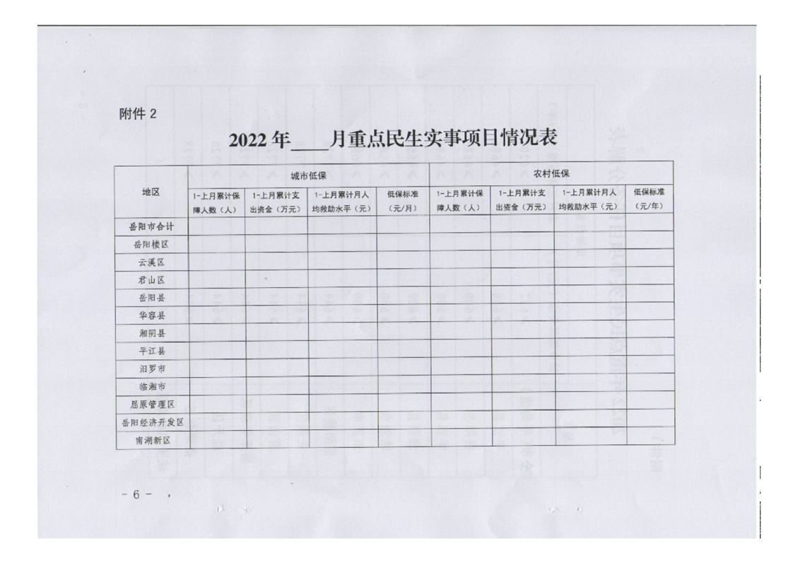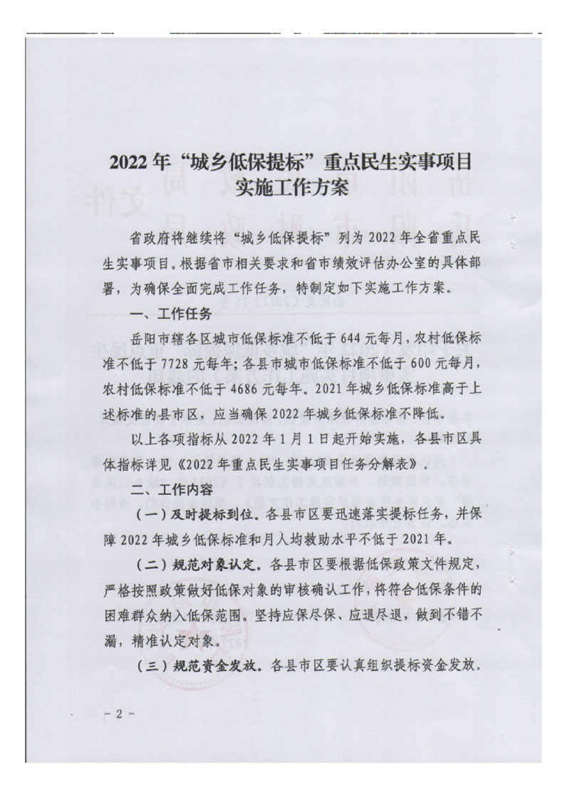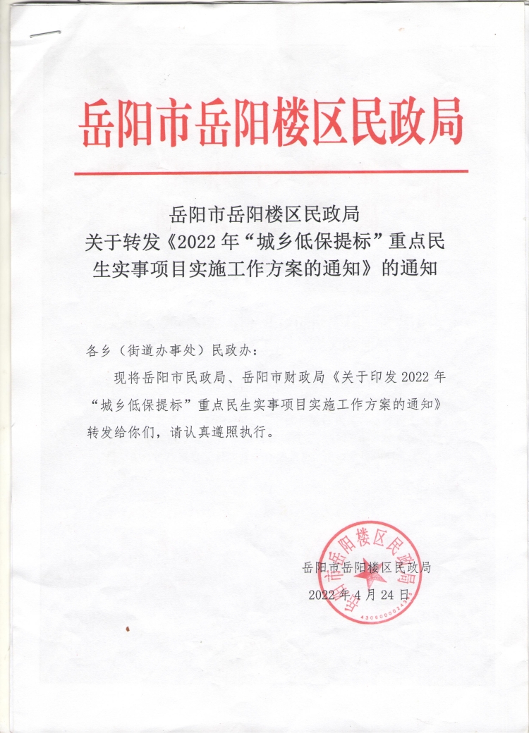 岳阳市岳阳楼区民政局关于转发《2022年“城乡低保提标”重点民生实事项目实施工作方案》的通知