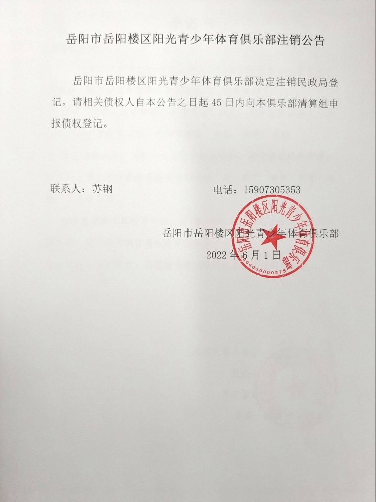 岳阳市岳阳楼区阳光青少年体育俱乐部注销公告