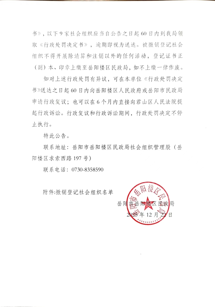 岳阳市岳阳楼区民政局《行政处罚决定书》送达公告