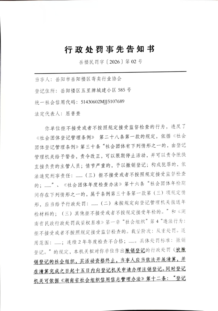 关于岳阳市岳阳楼区寄卖行业协会《行政处罚事先告知书》的送达公告