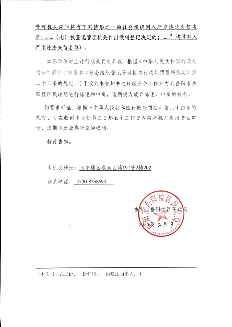 经调查,你单位拒不接受或者不按照规定接受监督检查的行为,违反了 《社会团体登记管理条例》 第二十八条第一款的规定,依据《社会团体登记管理条例》第三十条第(三)项、《社会团体年度检查办法》第十六条和《湖南省民政行政处罚裁量权基准》的相关规定,本机关拟对你单位作出撤销登记的行政处罚。因其他方式无法送达,现依法公告送达《行政处罚事先告知书》。你单位应当自公告之日起60日内到我局领取《行政处罚事先告知书》,逾期即视为送达。