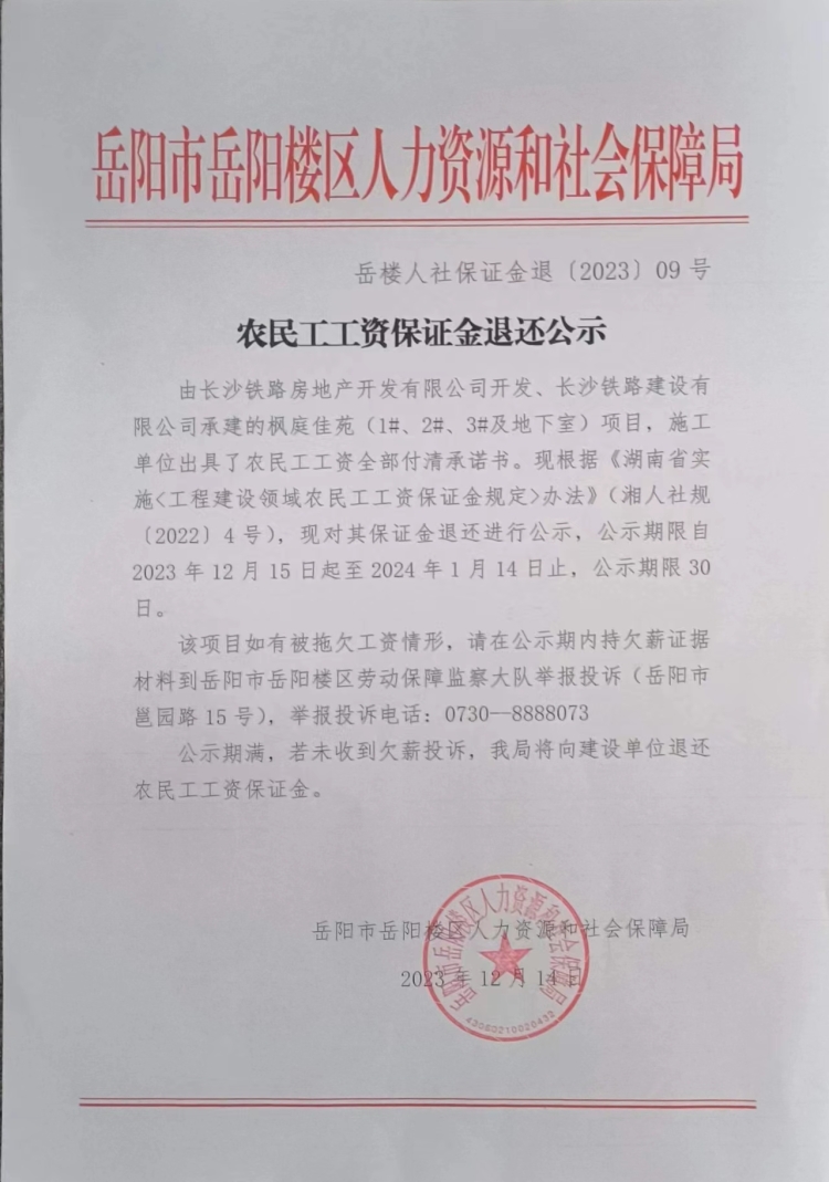 农民工工资保证金退还公示 岳楼人社保证金退〔2023〕09号