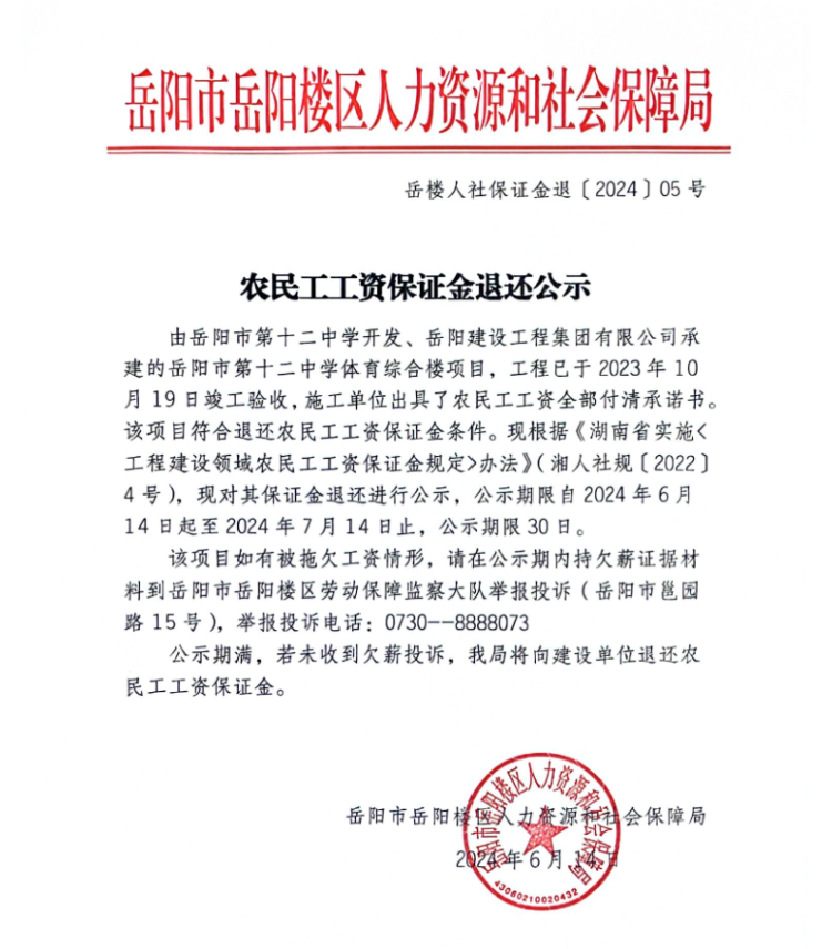 农民工工资保证金退还公示 岳楼人社保证金退〔2024〕05号