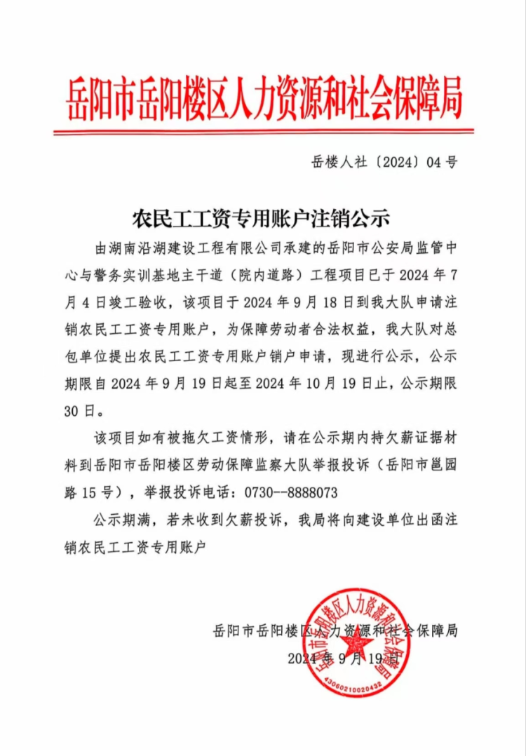 农民工工资专用账户注销公示 岳楼人社〔2024〕04号