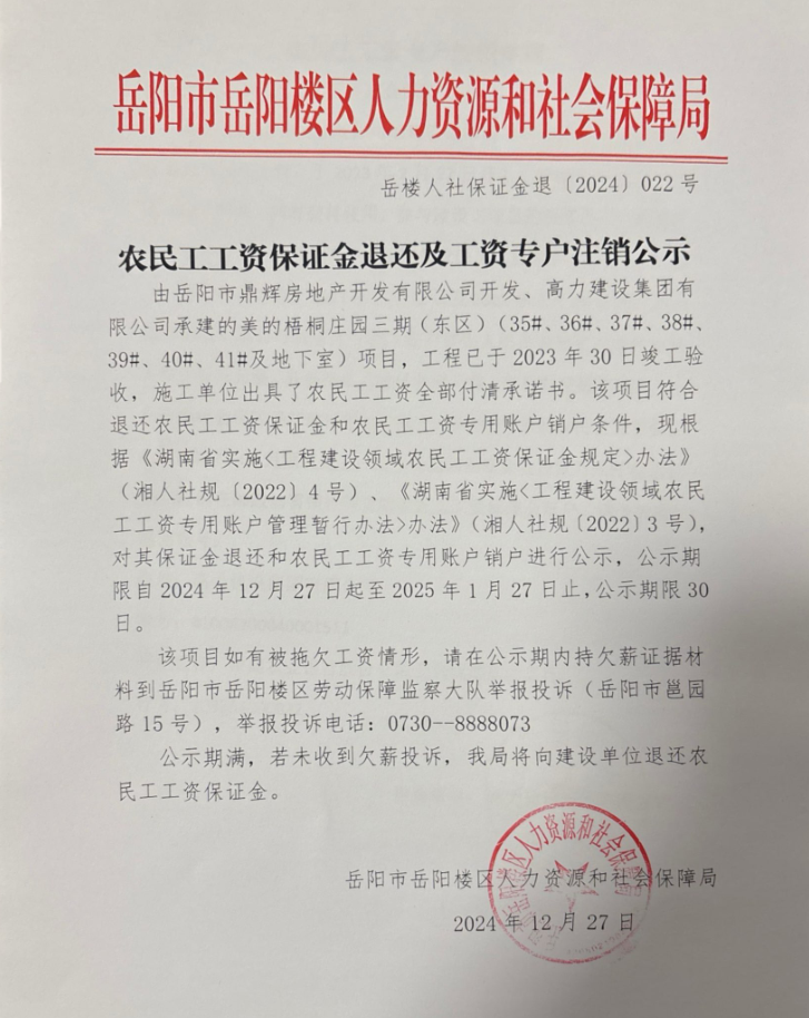 农民工工资保证金退还及工资专户注销公示 岳楼人社保证金退〔2024〕022号