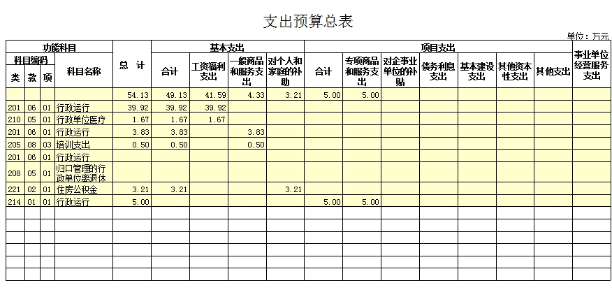 预算总支出54.13万元,其中:基本支出49.13万元(工资福利支出41.59万元、一般商品和服务支出4.33万元、对个人和家庭的补助支出3.21万元);项目支出5万元。