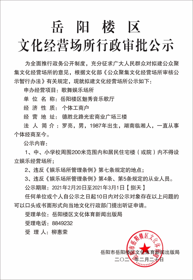 岳阳楼区公众聚集文化经营场所公示(魅秀音乐歌厅)