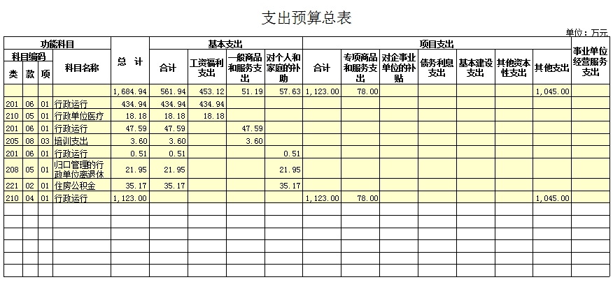 预算总支出1684.94万元,其中:基本支出561.94万元(工资福利支出453.12万元、一般商品和服务支出51.19万元、对个人和家庭的补助支出57.63万元);项目支出78万元。非税执收成本1045万元。