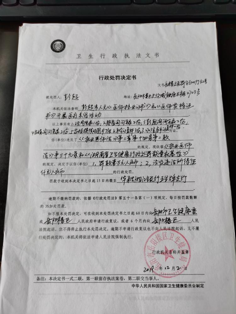彭超 无《医师资格证》,无《医师执业证书》擅自开展医疗美容案行政处罚决定书