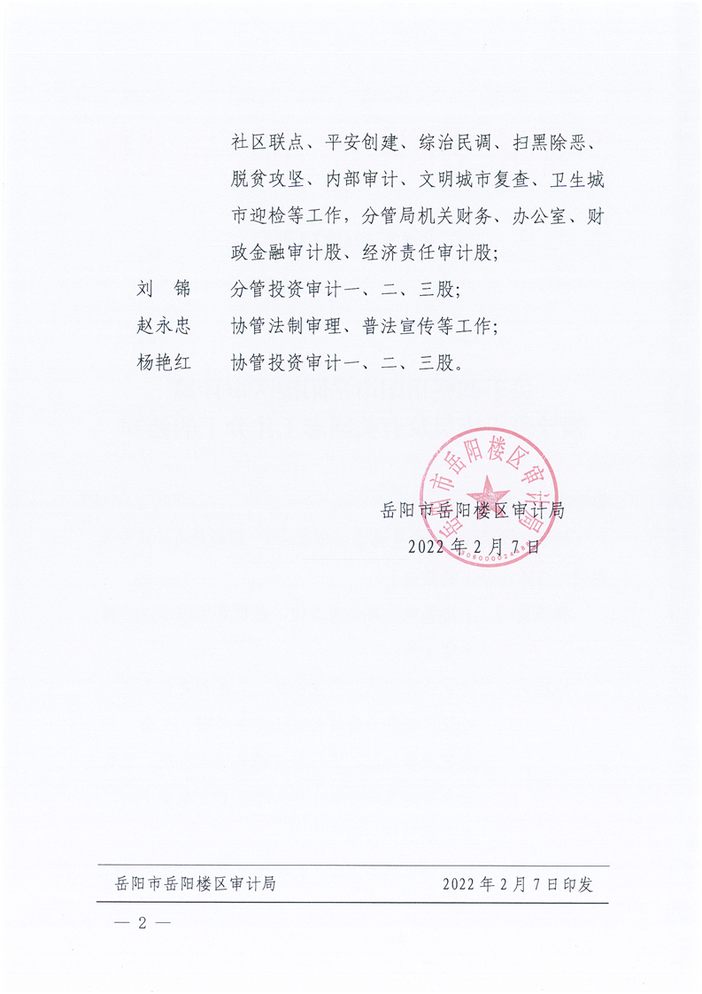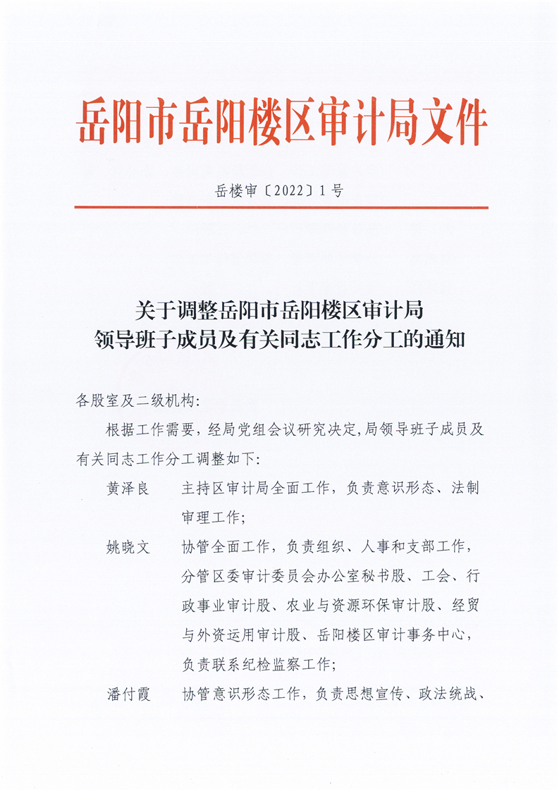 关于调整岳阳市岳阳楼区审计局领导班子成员及有关同志工作分工的通知