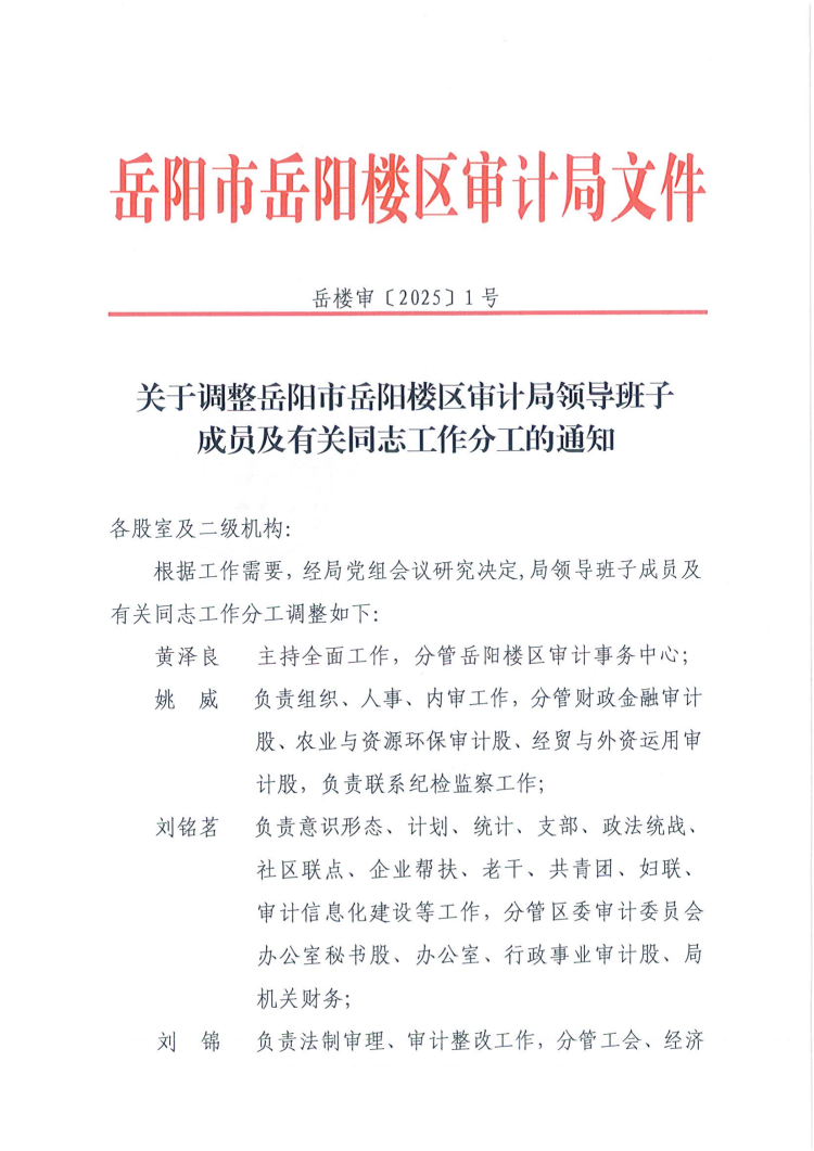 关于调整岳阳楼区审计局领导班子成员及有关同志工作分工的通知(岳楼审〔2025〕1号)
