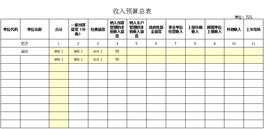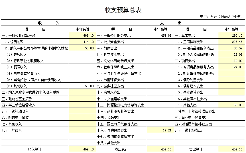 预算总收入469.1万元,其中:经费拨款414.1万元;纳入预算管理的非税收入拨款55万元。