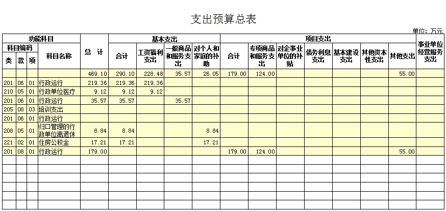 预算总支出469.1万元,其中:基本支出290.1万元(工资福利支出228.48万元、一般商品和服务支出33.57万元、对个人和家庭的补助支出26.05万元);项目支出124万元。非税执收成本55万元。