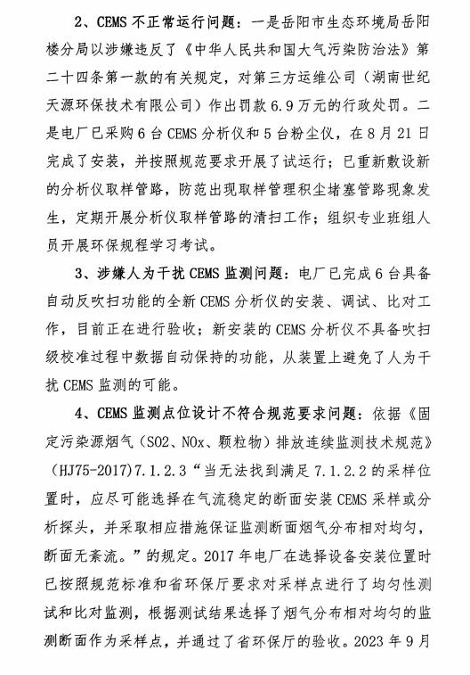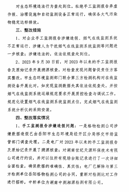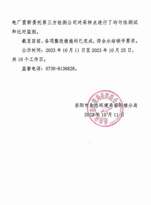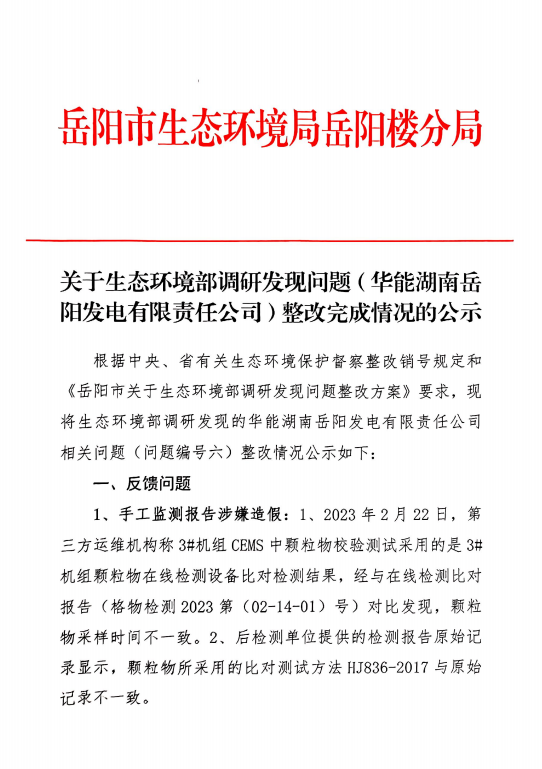 关于生态环境部调研发现问题(华能湖南岳阳发电有限责任公司)整改完成情况的公示