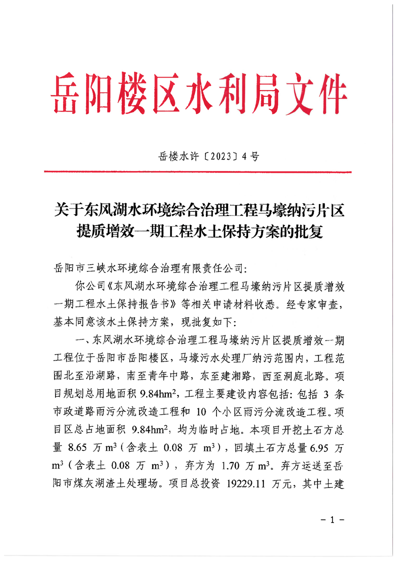 关于东风湖水环境综合治理工程马壕纳污片区提质增效一期工程水土保持方案的批复