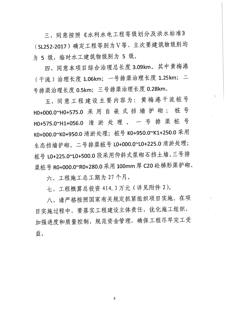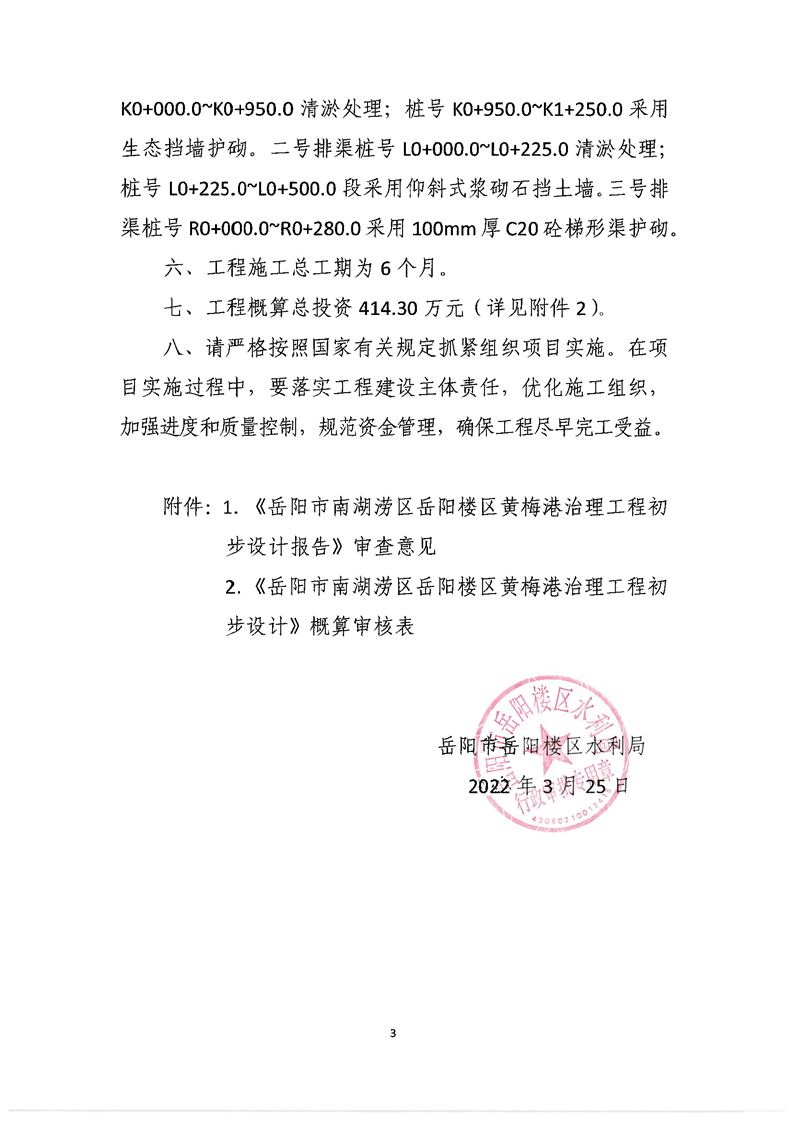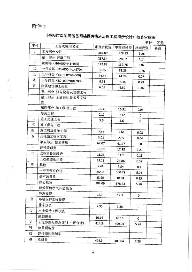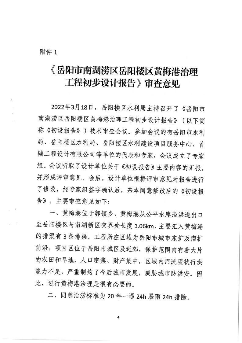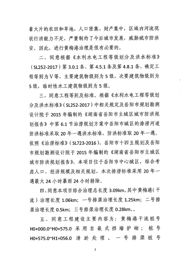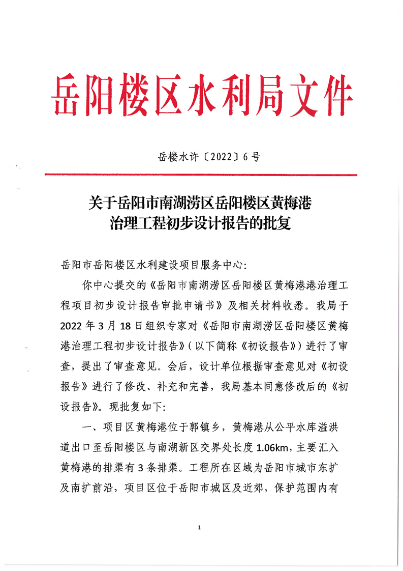 关于岳阳市南湖涝区岳阳楼区黄梅港治理工程初步设计报告的批复