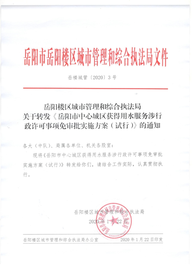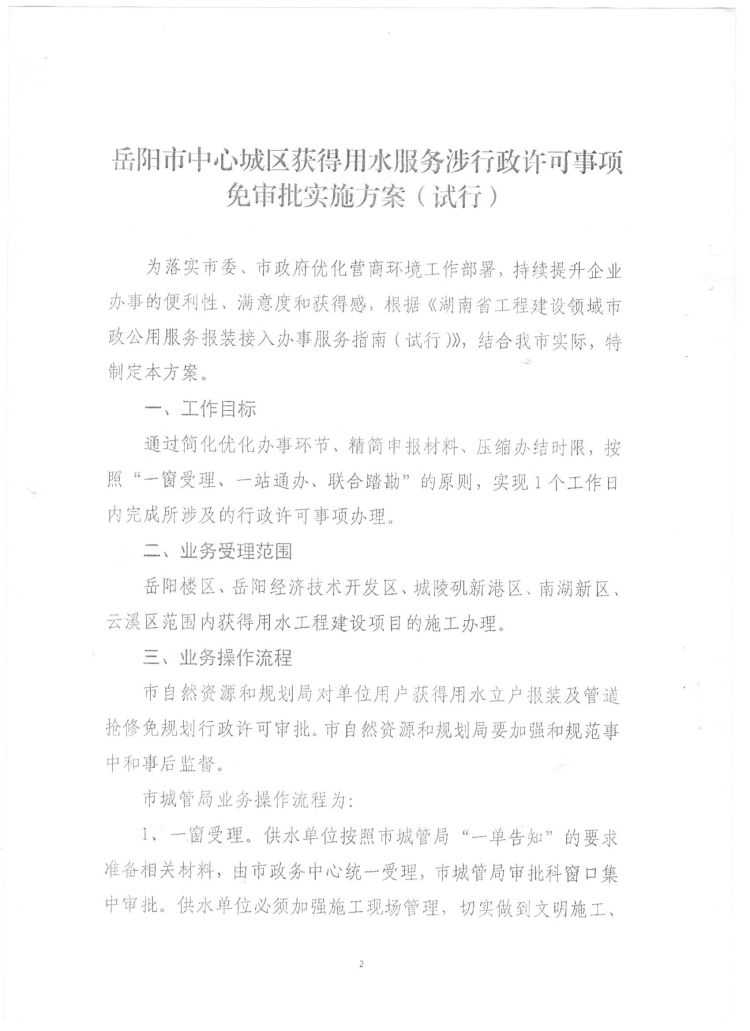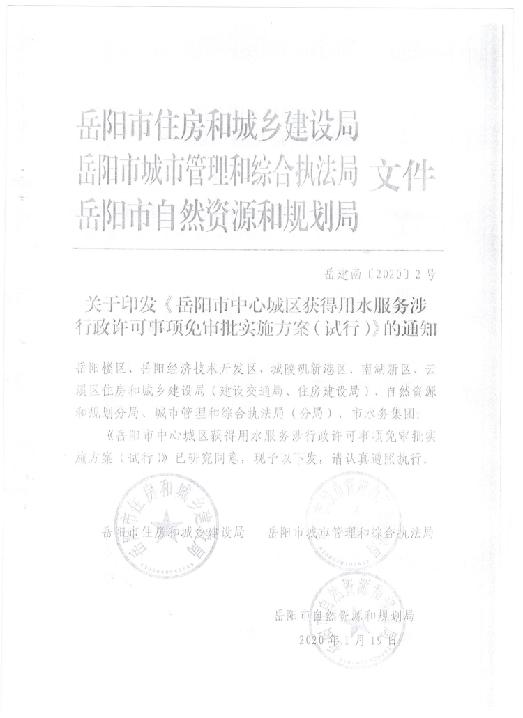 转发岳阳市中心城区获得用水服务涉行政许可事项免审批实施方案(试行)的通知