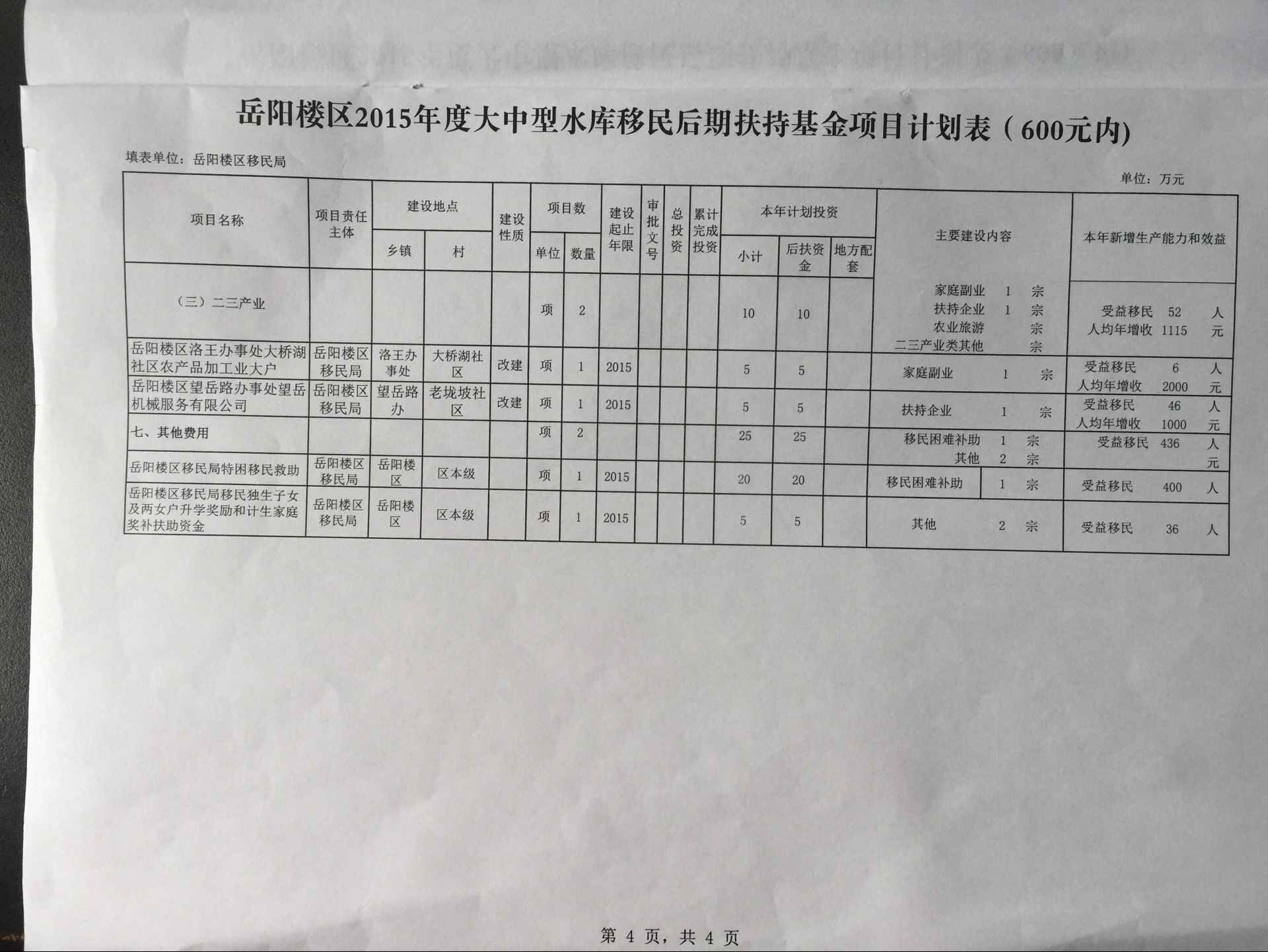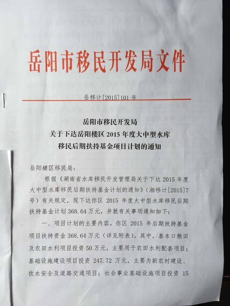 岳阳楼区2015年度大中型水库移民后期扶持基金项目计划(600元内)