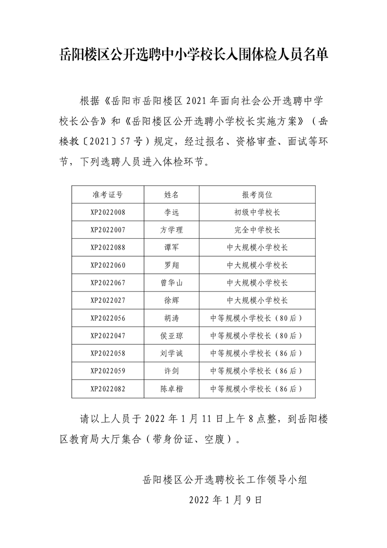 岳阳楼区公开选聘中小学校长入围体检人员名单
