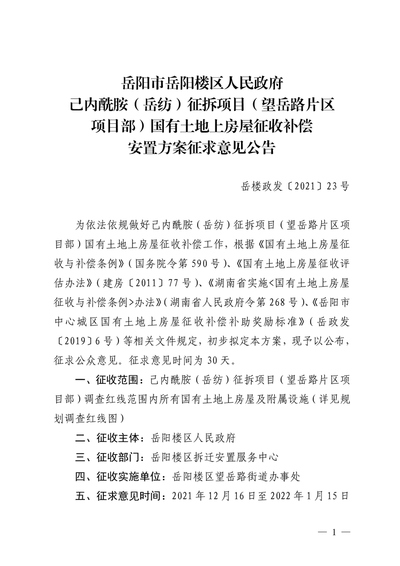 岳阳市岳阳楼区人民政府己内酰胺(岳纺)征拆项目(望岳路片区项目部)国有土地上房屋征收补偿安置方案征求意见公告