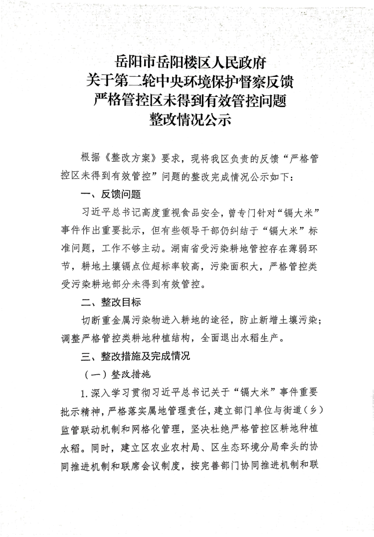 关于第二轮中央环境保护督察反馈严格管控区未得到有效管控问题整改情况公示