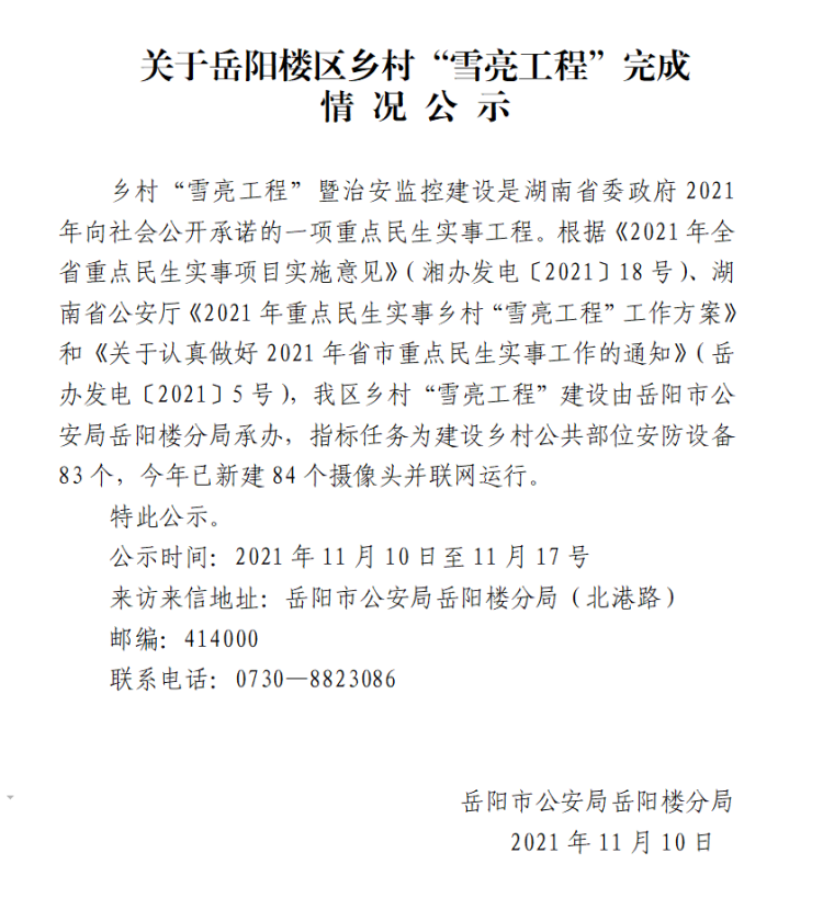关于岳阳楼区乡村“雪亮工程”的公示