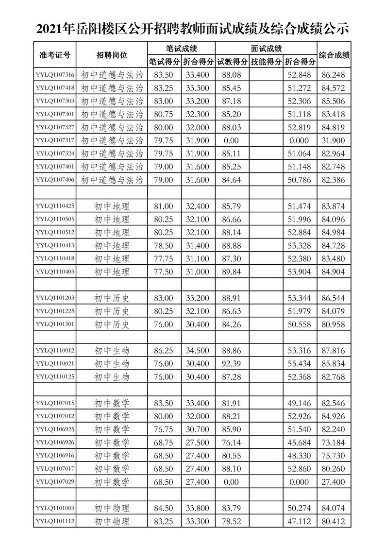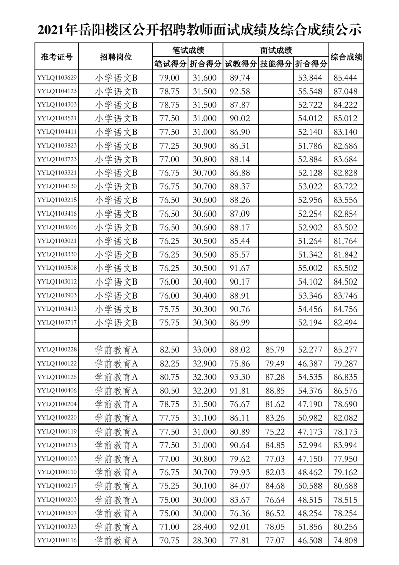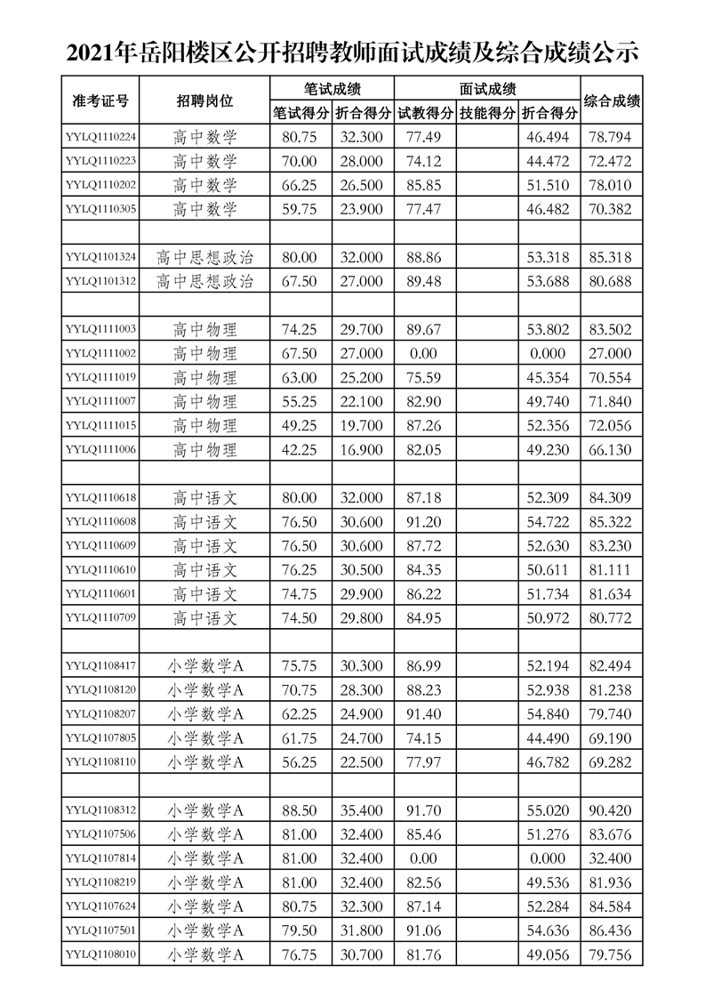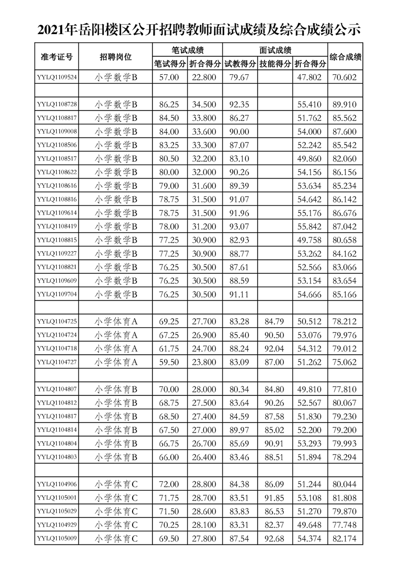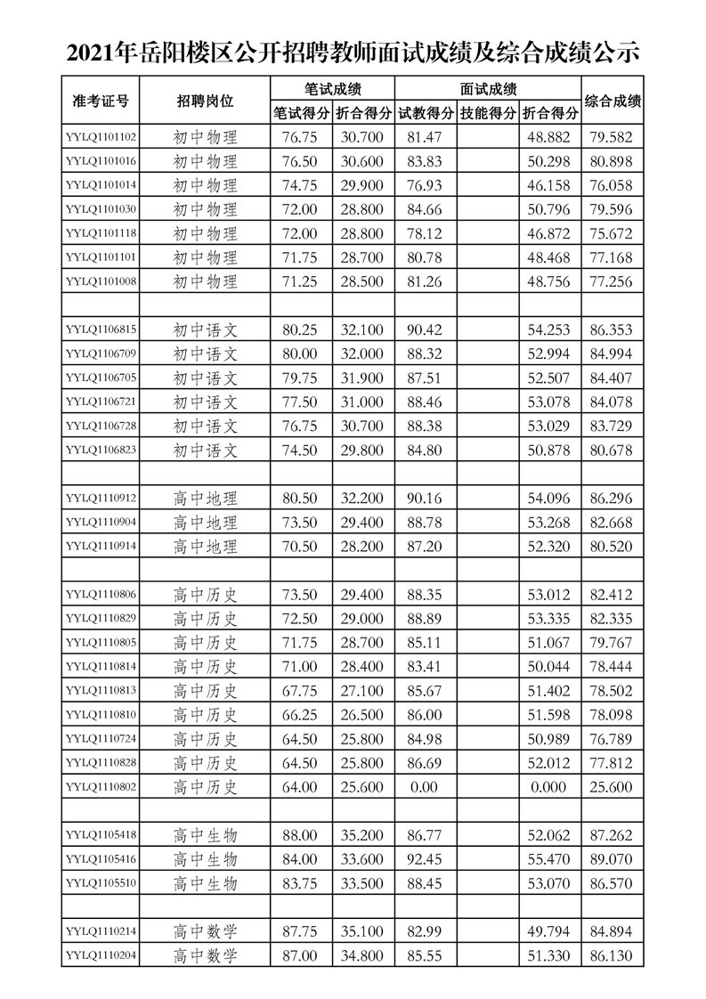 2021年岳阳楼区公开招聘教师面试成绩及综合成绩公示