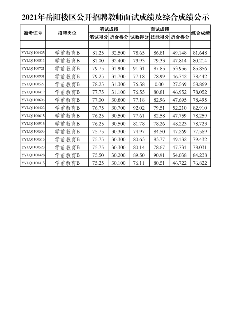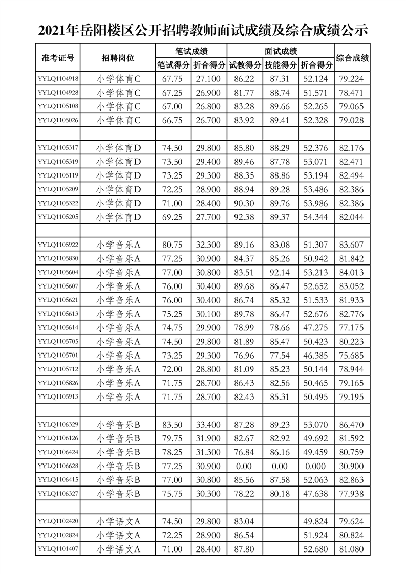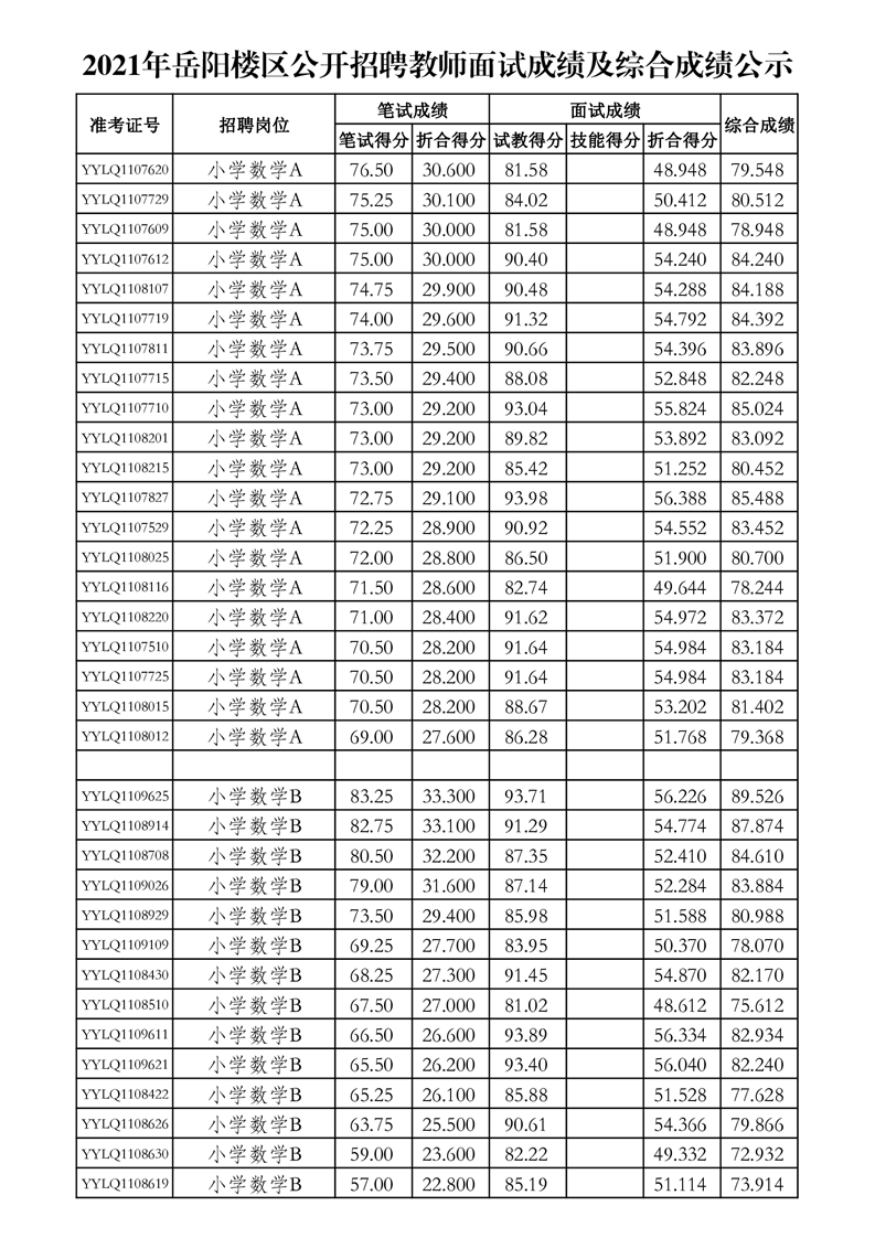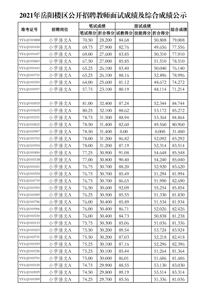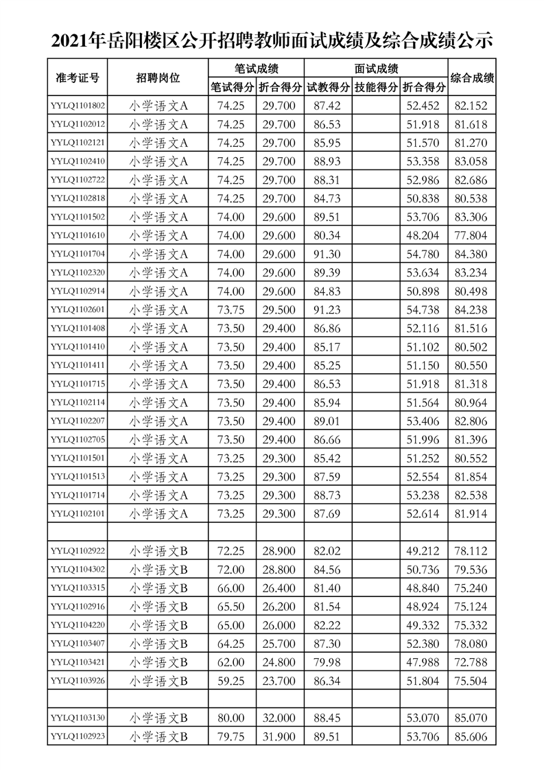 2021年岳阳楼区公开招聘教师面试成绩及综合成绩公示