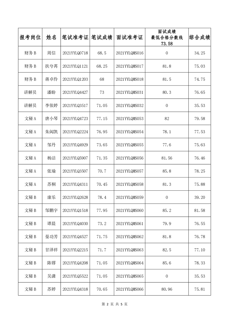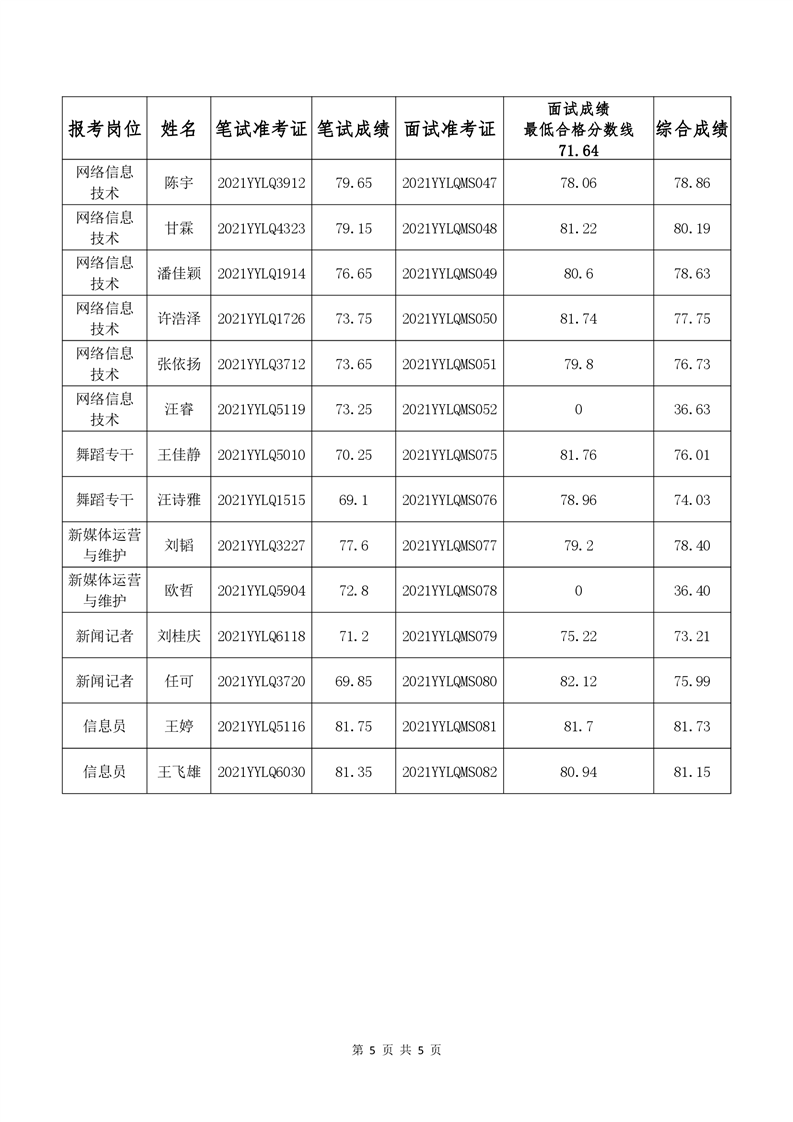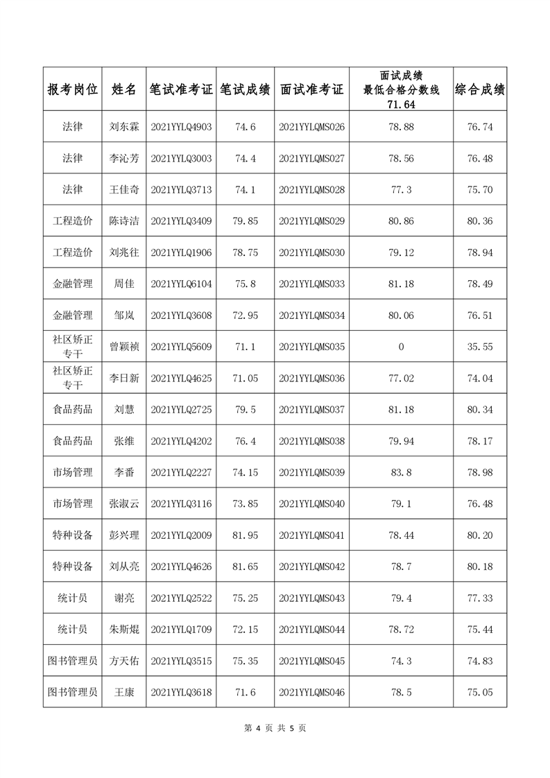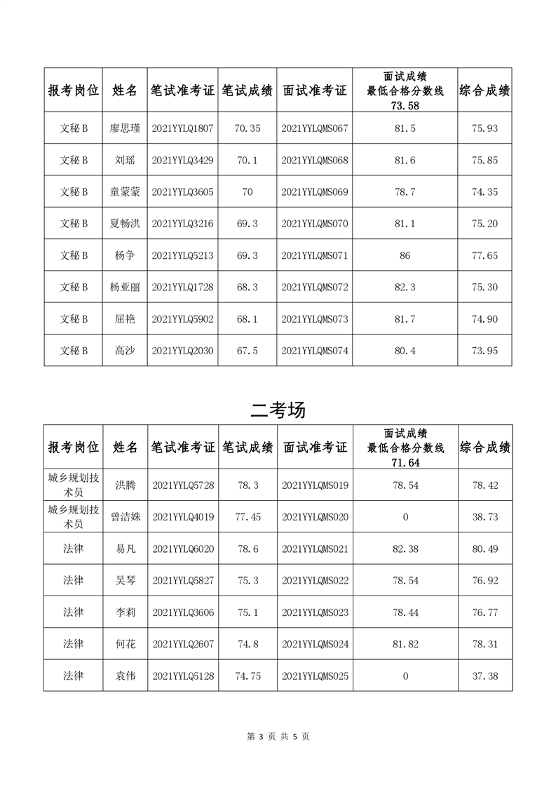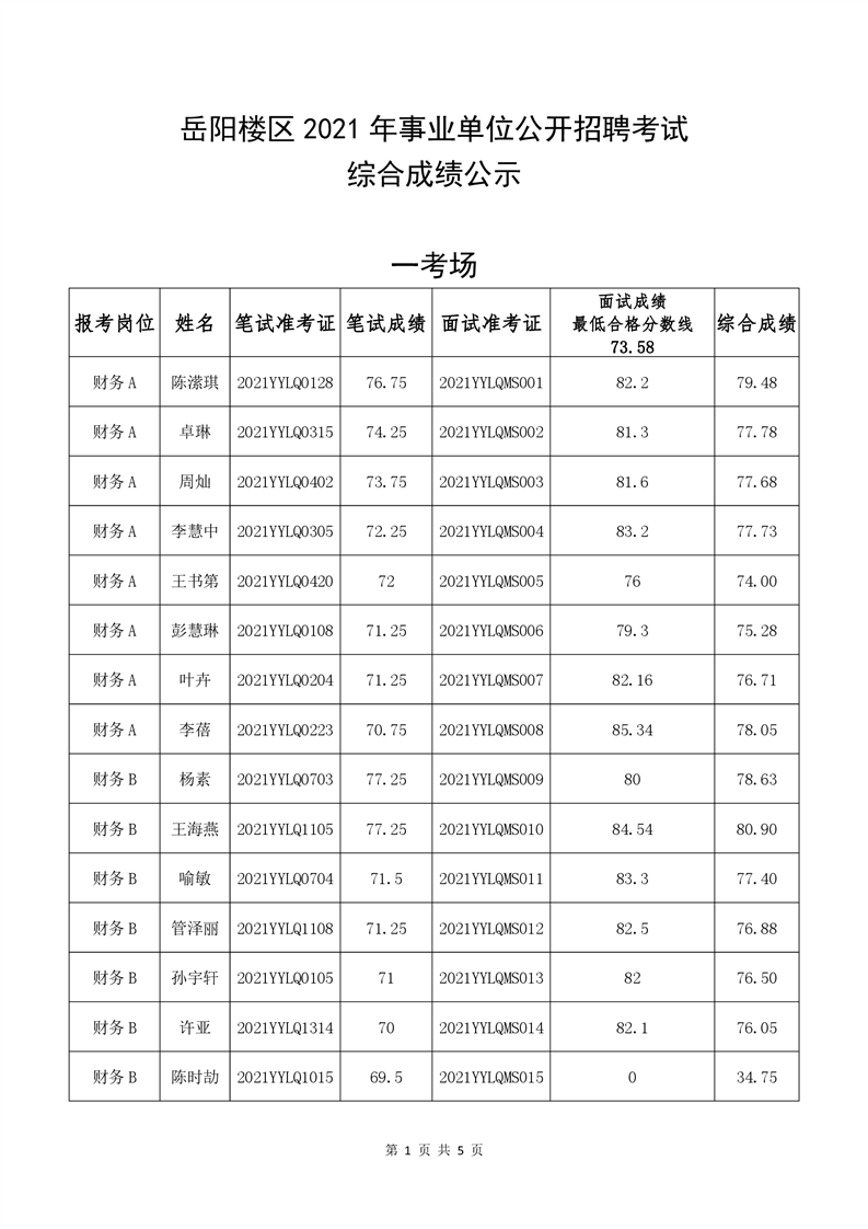 岳阳楼区2021年事业单位公开招聘考试综合成绩公示