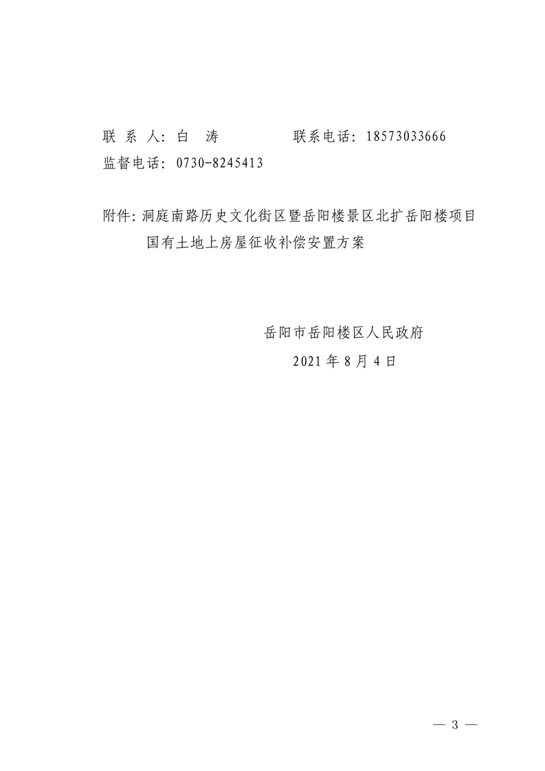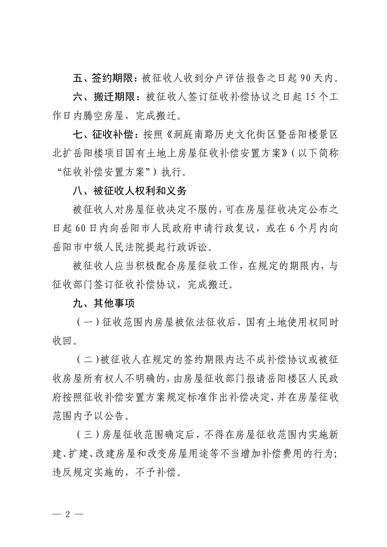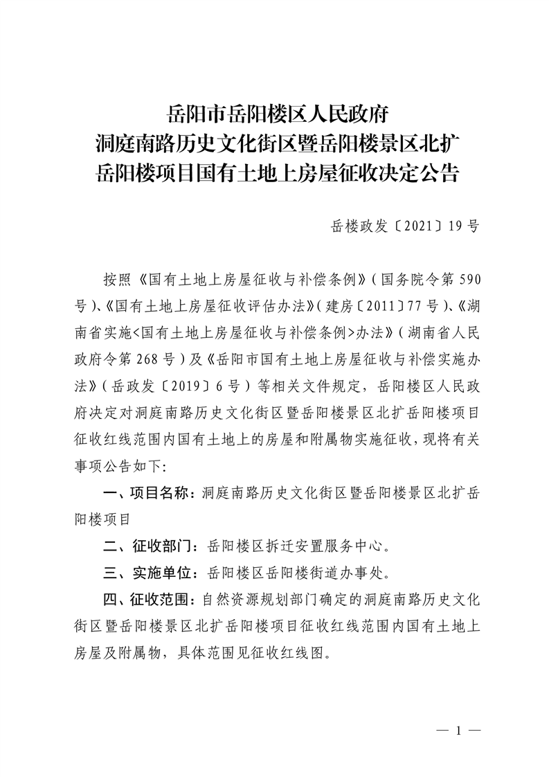 岳阳市岳阳楼区人民政府 洞庭南路历史文化街区暨岳阳楼景区北扩岳阳楼项目国有土地上房屋征收决定公告