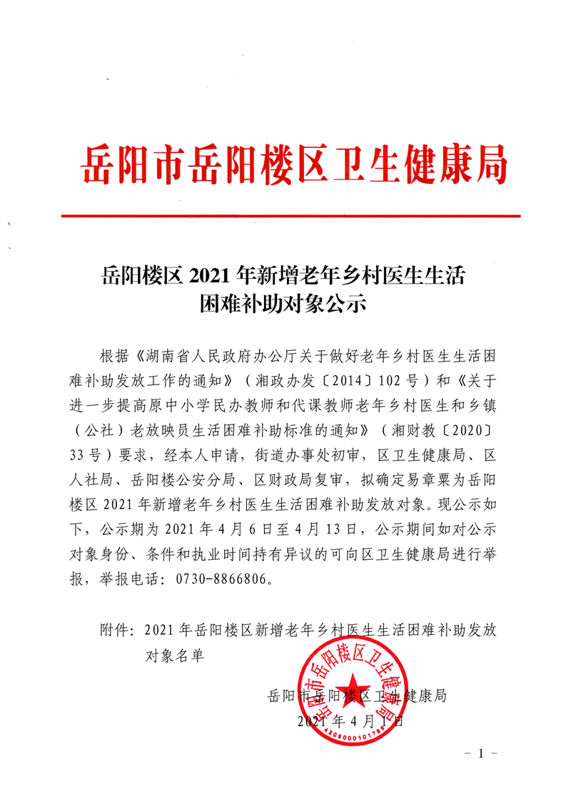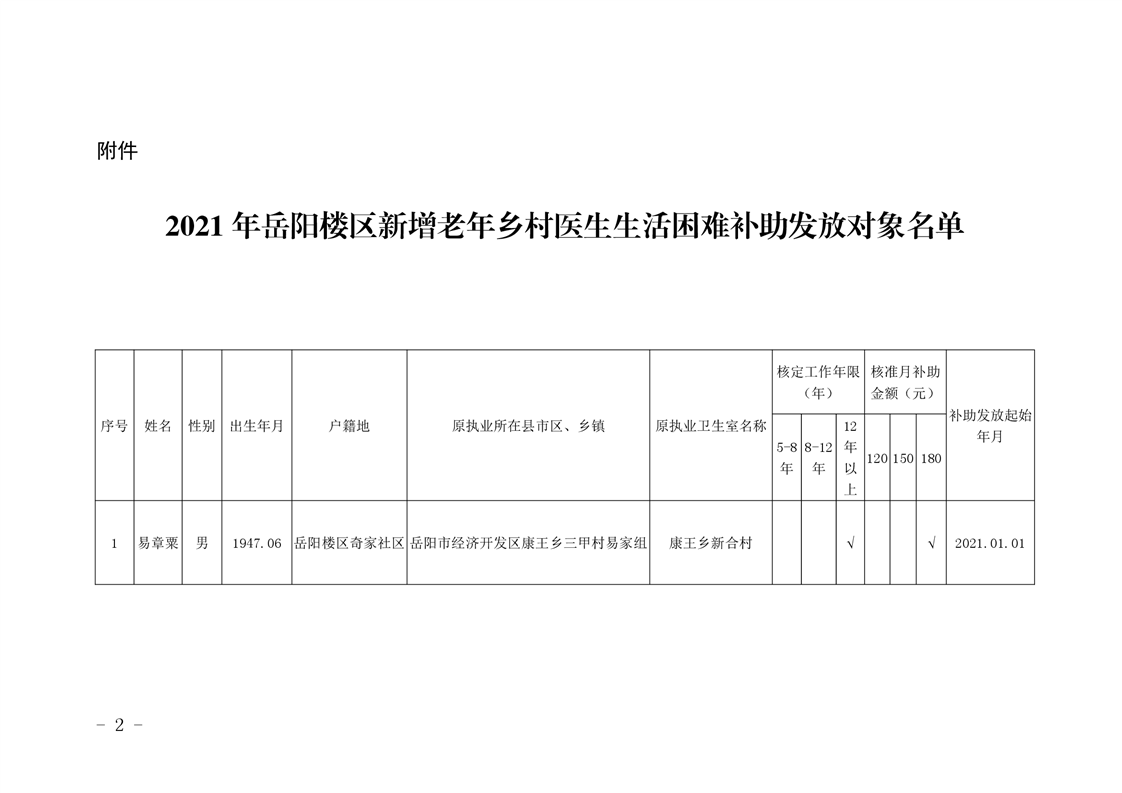 岳阳楼区2021年新增老年乡村医生生活困难补助对象公示