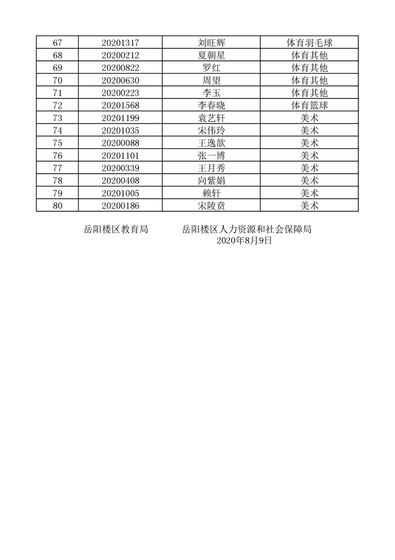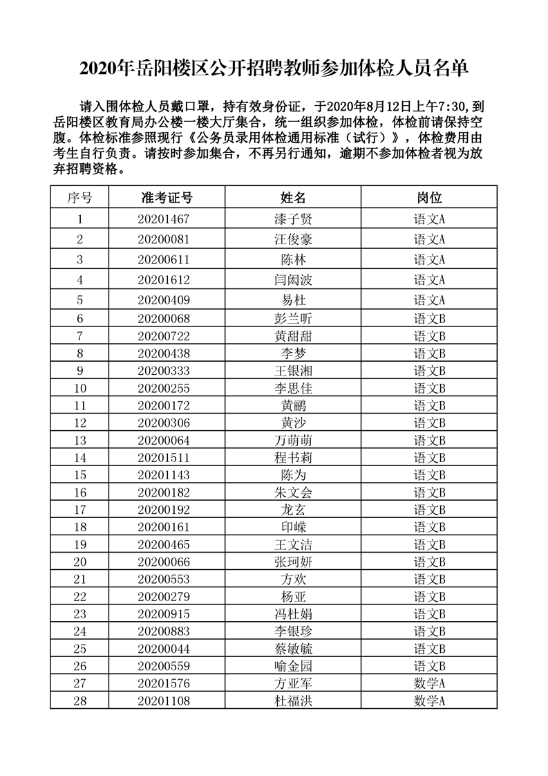 2020年岳阳楼区公开招聘教师参加体检人员名单